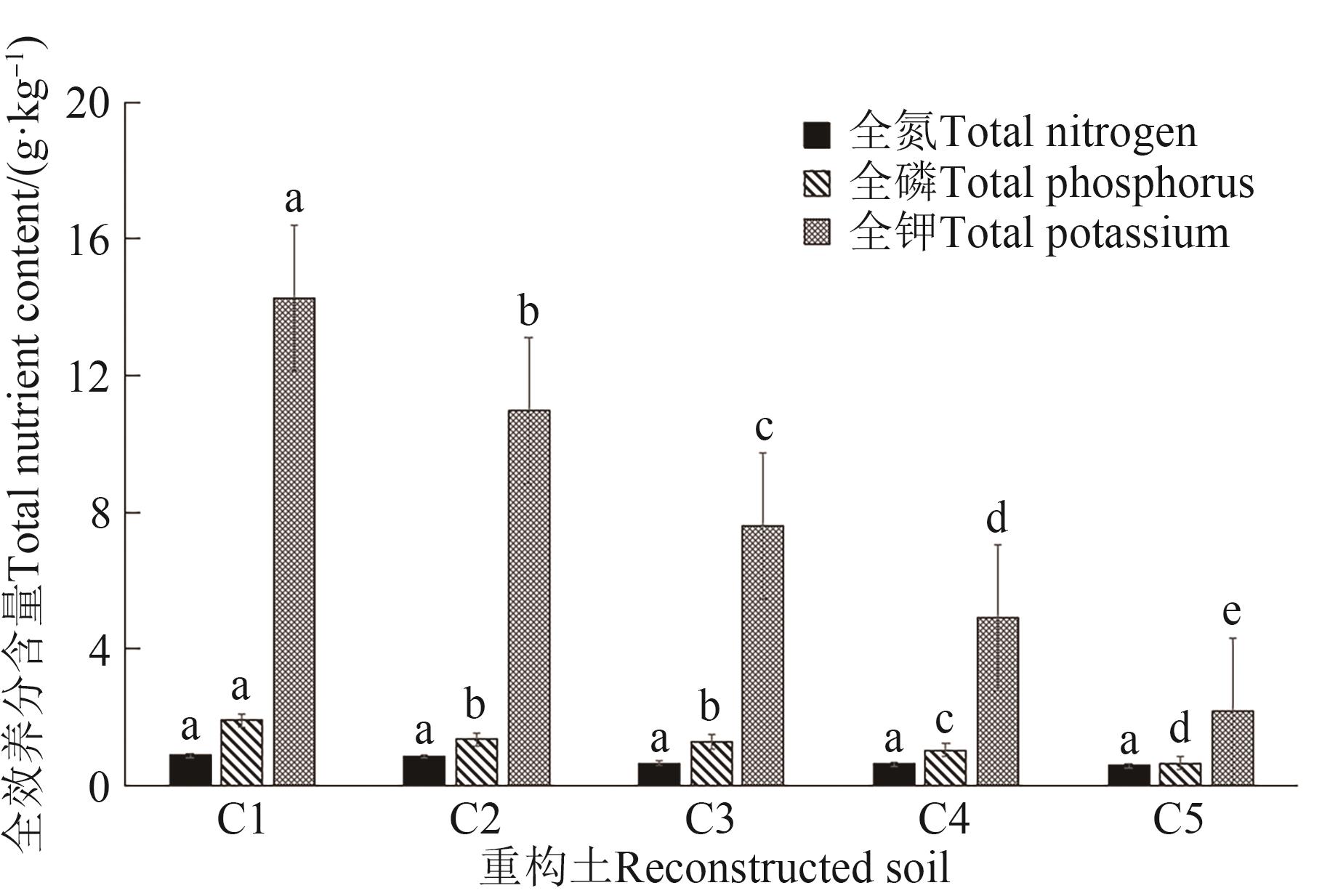 Fig. 5 Total nutrient content of different reconstructed soilsNote:Different small letters indicate significant differences between different treatments at P<0.05 level.
