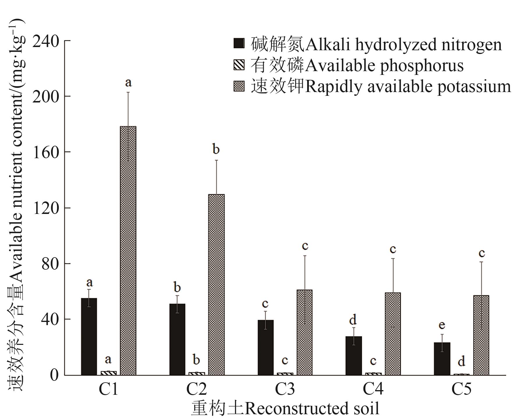 Fig. 6 Available nutrient content of different reconstructed soilsNote:Different small letters indicate significant differences between different treatments at P<0.05 level.