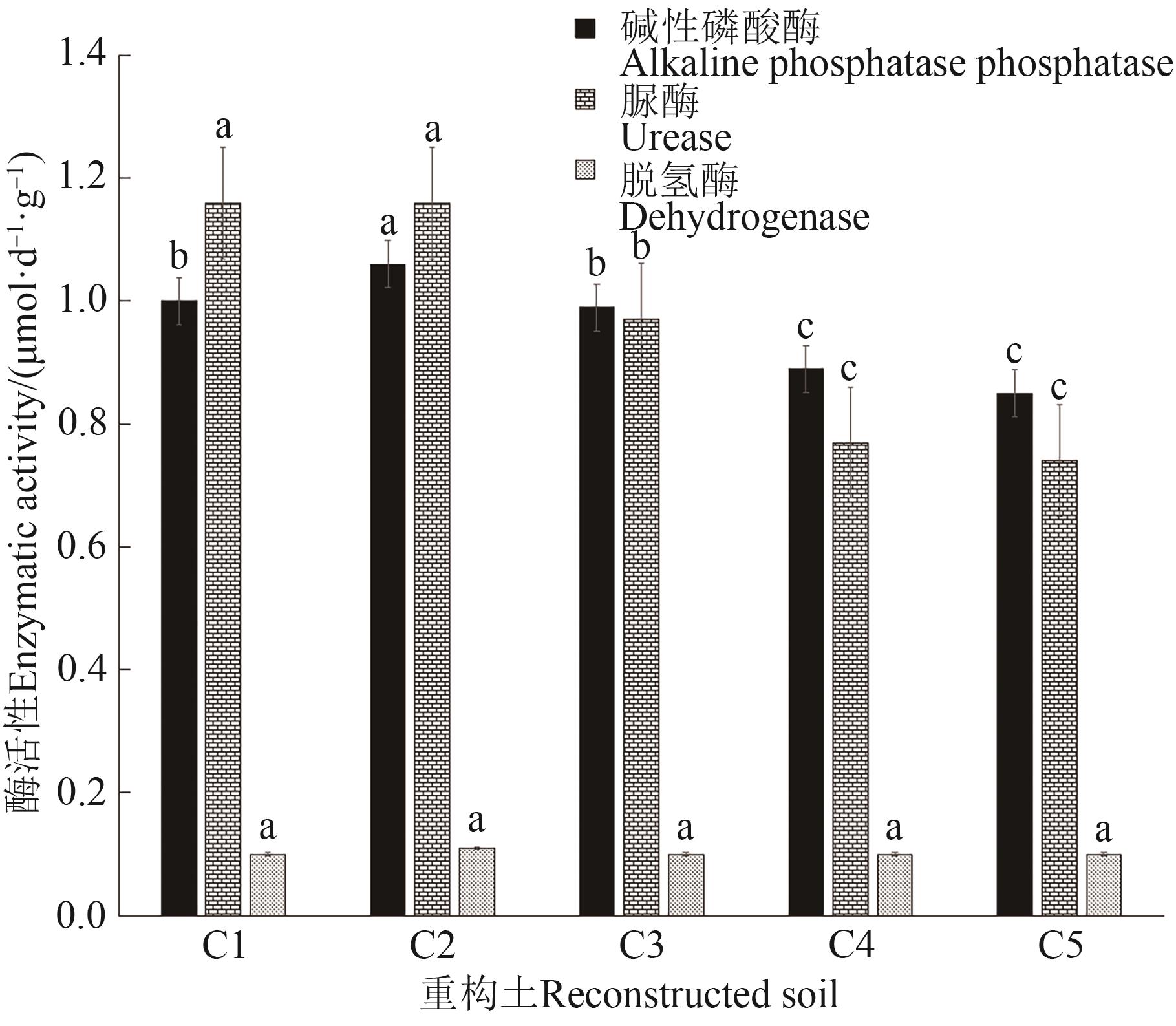 Fig. 7 Characteristics of enzyme activity in different reconstructed soilsNote:Different small letters indicate significant differences between different treatments at P<0.05 level.