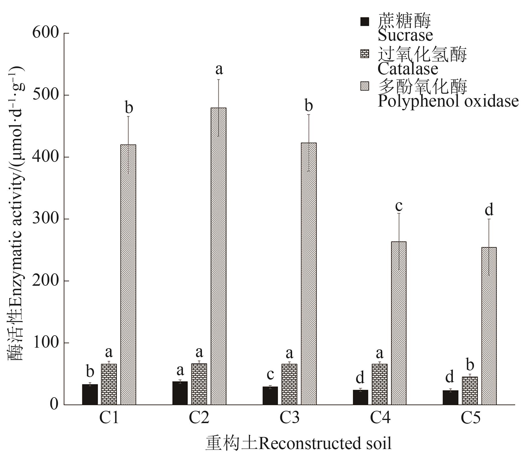 Fig. 8 Characteristics of enzyme activity in different reconstructed soilsNote:Different small letters indicate significant differences between different treatments at P<0.05 level.
