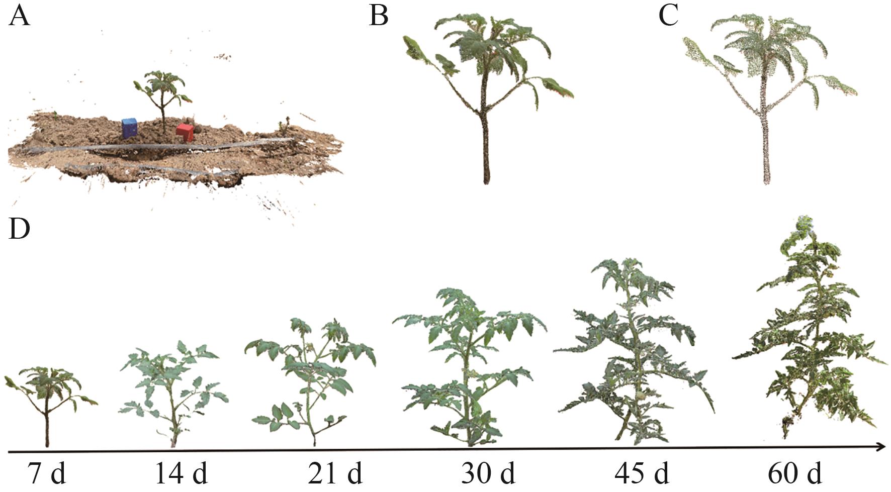 图2 番茄植株点云重建及预处理A:稠密点云;B:点云去噪;C:点云精简;D:番茄植株动态生长重建情况