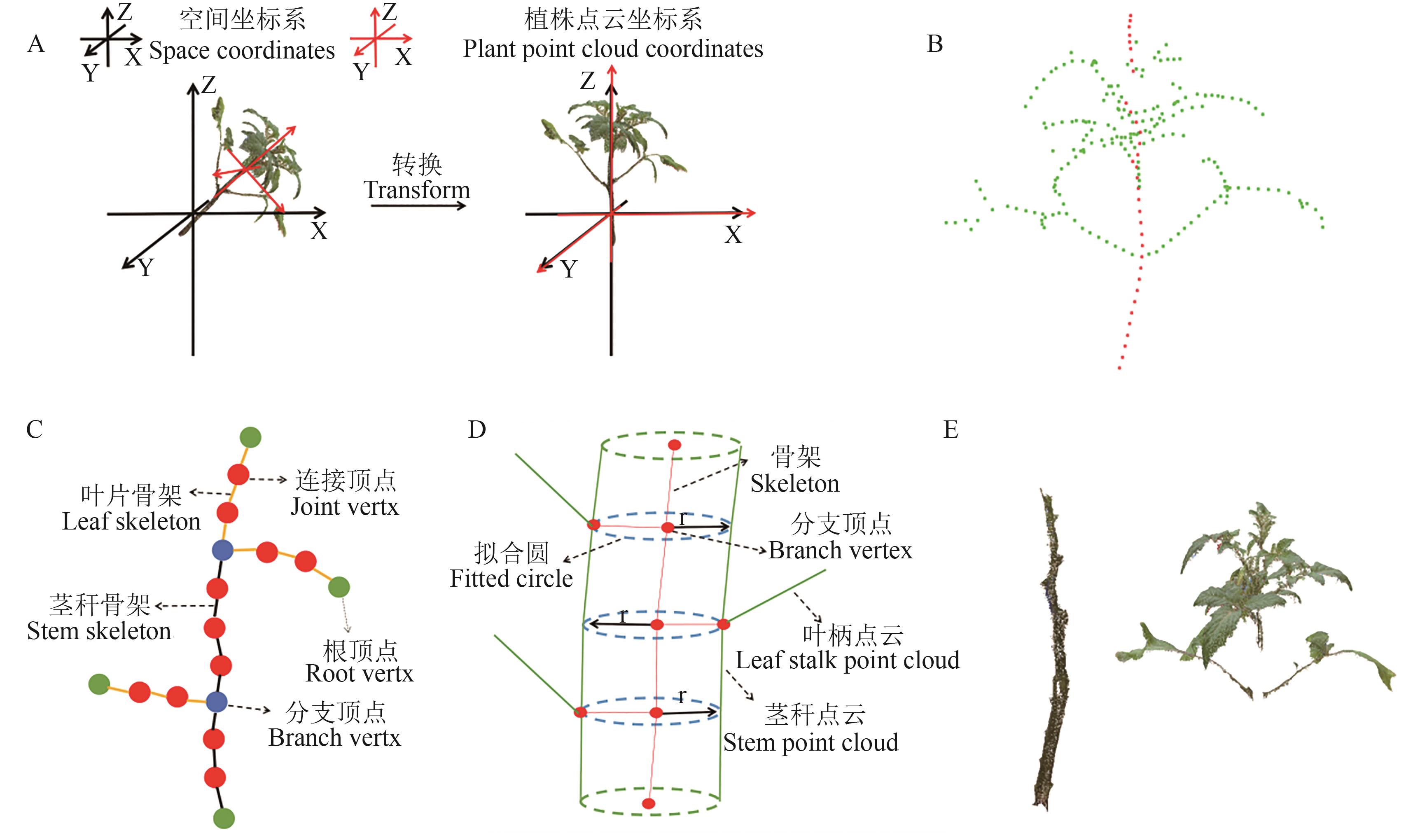 图4 茎秆提取示意A:坐标系转换;B:提取的骨架最高点路径;C:高度约束;D:半径约束;E:分离后的茎杆与叶片