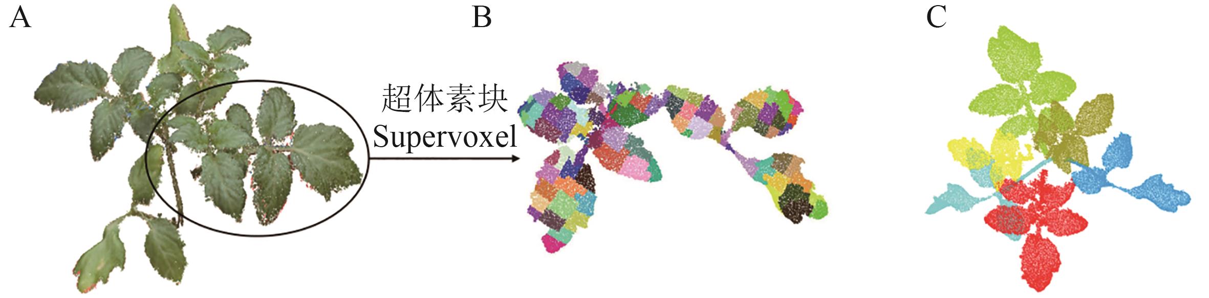图7 不同算法参数的叶片分割结果A:参数设置过小;B:参数设置过大;C:参数设置适中