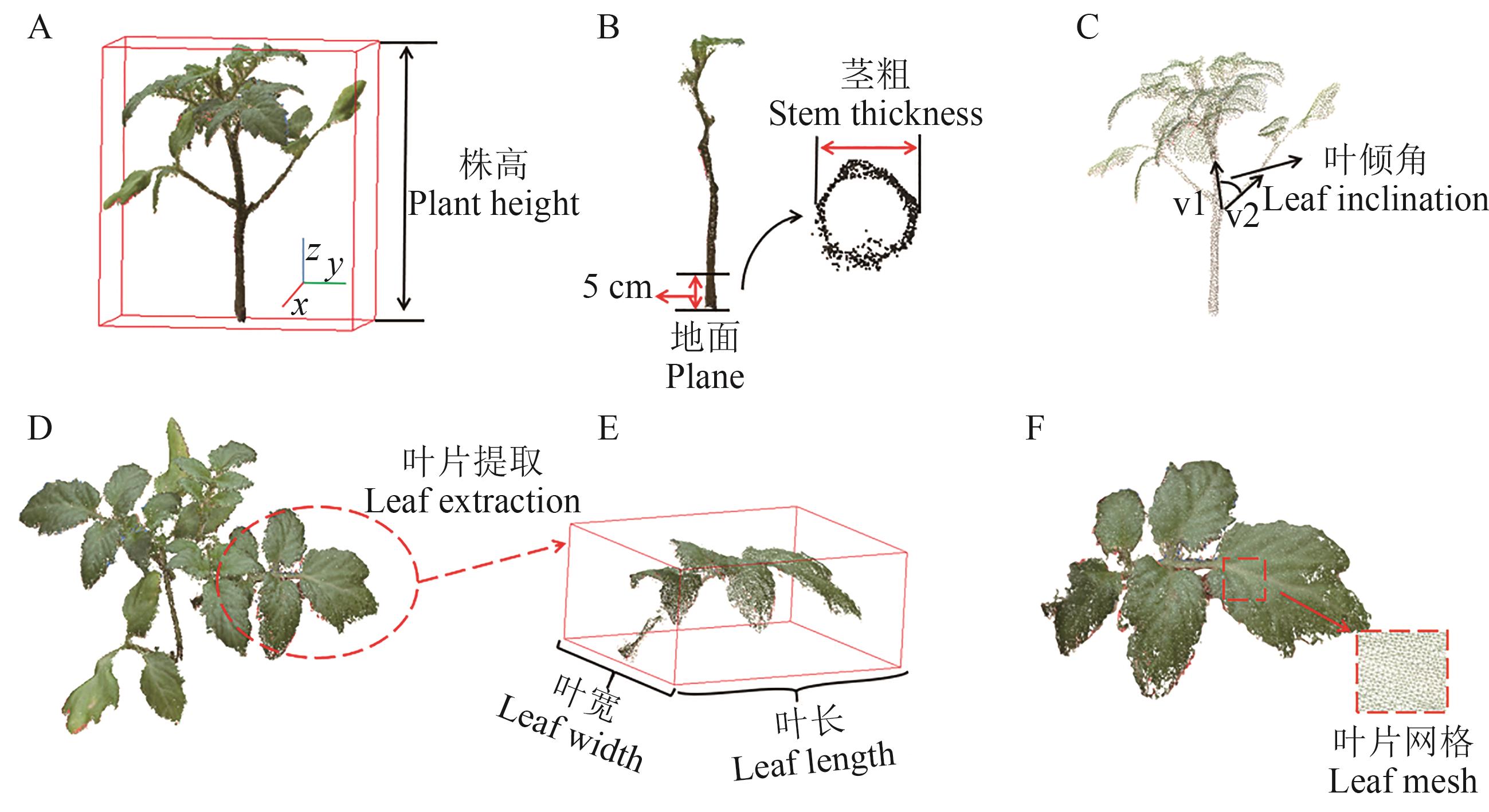 图6 表型参数测量A:株高;B:茎粗;C:叶倾角;D:叶片点云;E:叶长和叶宽;F:叶面积