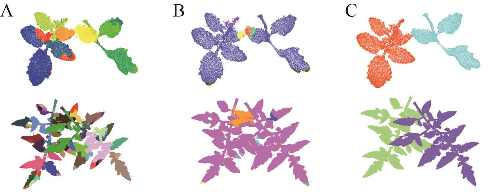Fig. 7 Leaf segmentation results with different algorithm parametersA:Parameter setting too small; B:Parameter setting too large; C:Moderate parameter setting