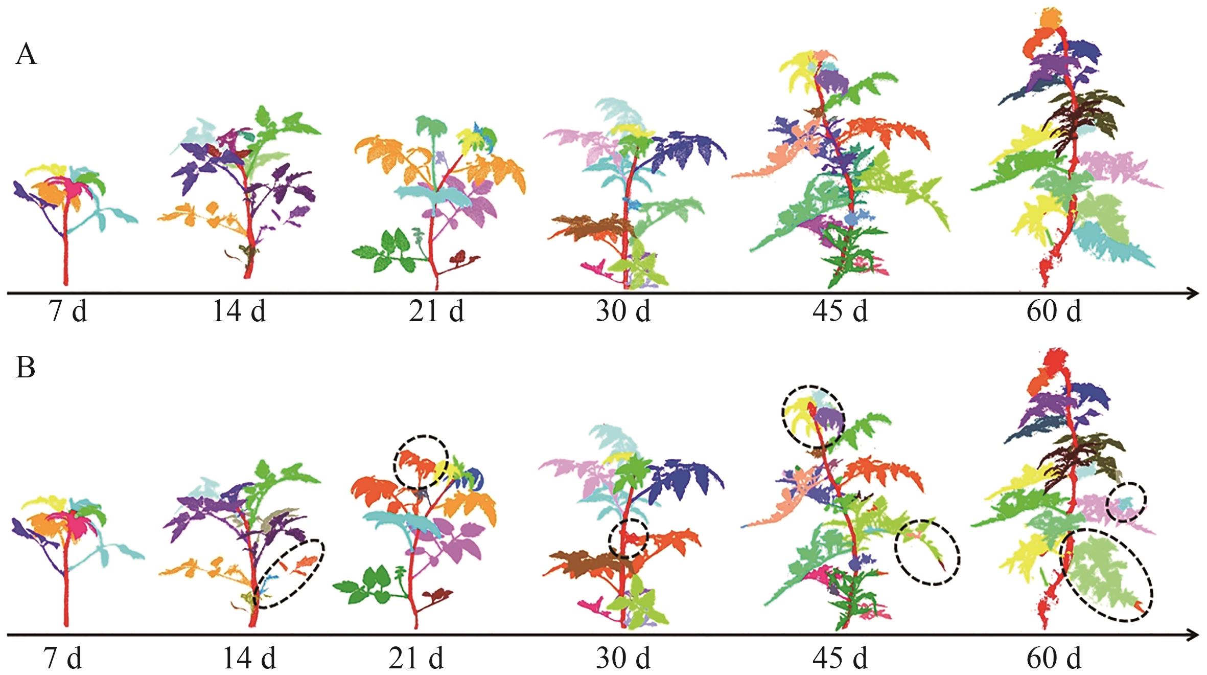 图8 不同生长天数的番茄茎叶分割结果A:手动分割真值;B:算法分割结果。黑色圈代表算法分割错误部分