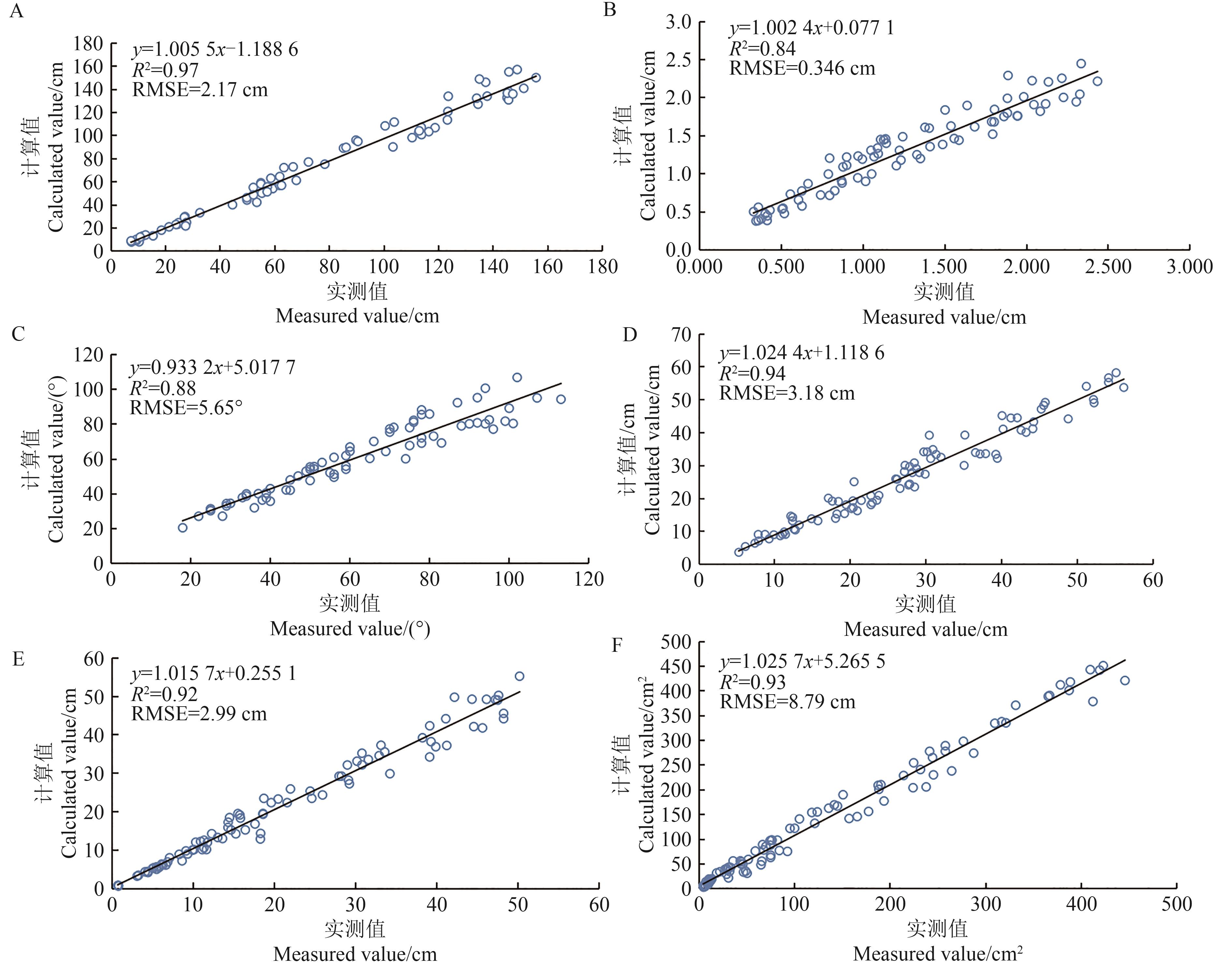 Fig. 10 Phenotypic parameter measurement resultsA: Plant height; B:Stem thickness; C:Leaf inclination; D:Leaf length; E:Leaf width; F:Leaf area