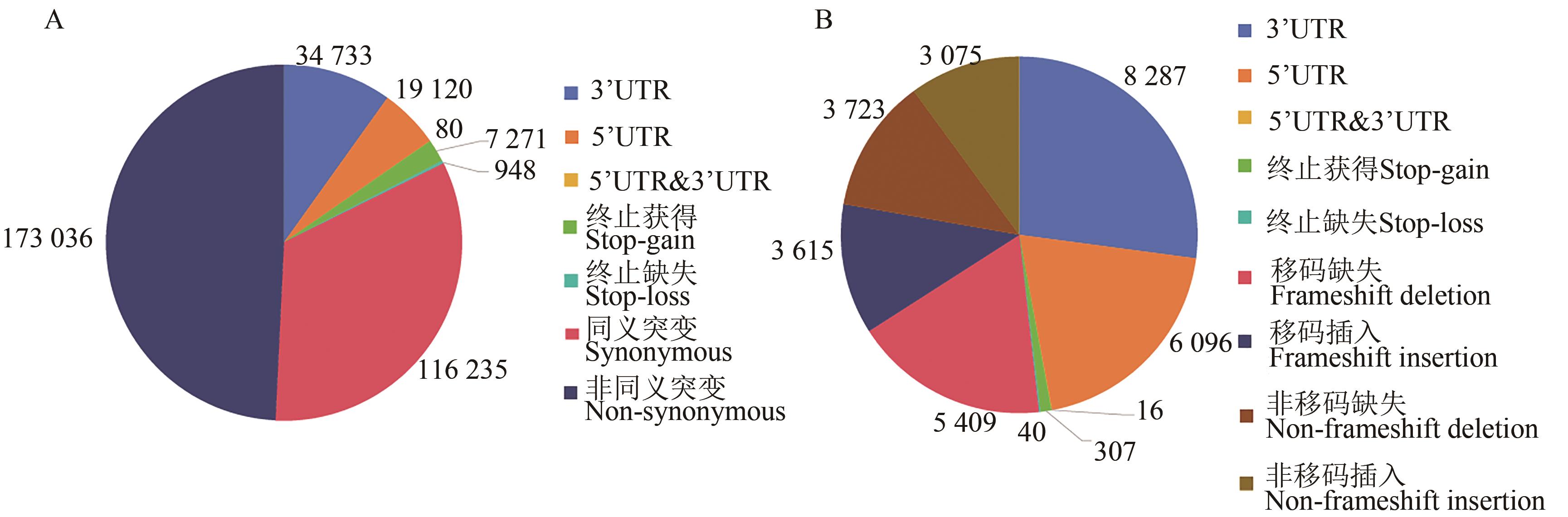 Fig. 2 Distribution of offspring gradient difference △SNPIand △IndelI on chromosomesA: △SNPI; B: △InDelI. The point in the figure represents SNP (Indel) site. Its abscissa is the middle value of the window where the SNP site is located, and the ordinate is the difference in index. Different chromosomes are distinguished by different colors; the black line in the figure is the mean value, the blue line is 95% threshold, and the purple line is 99% threshold