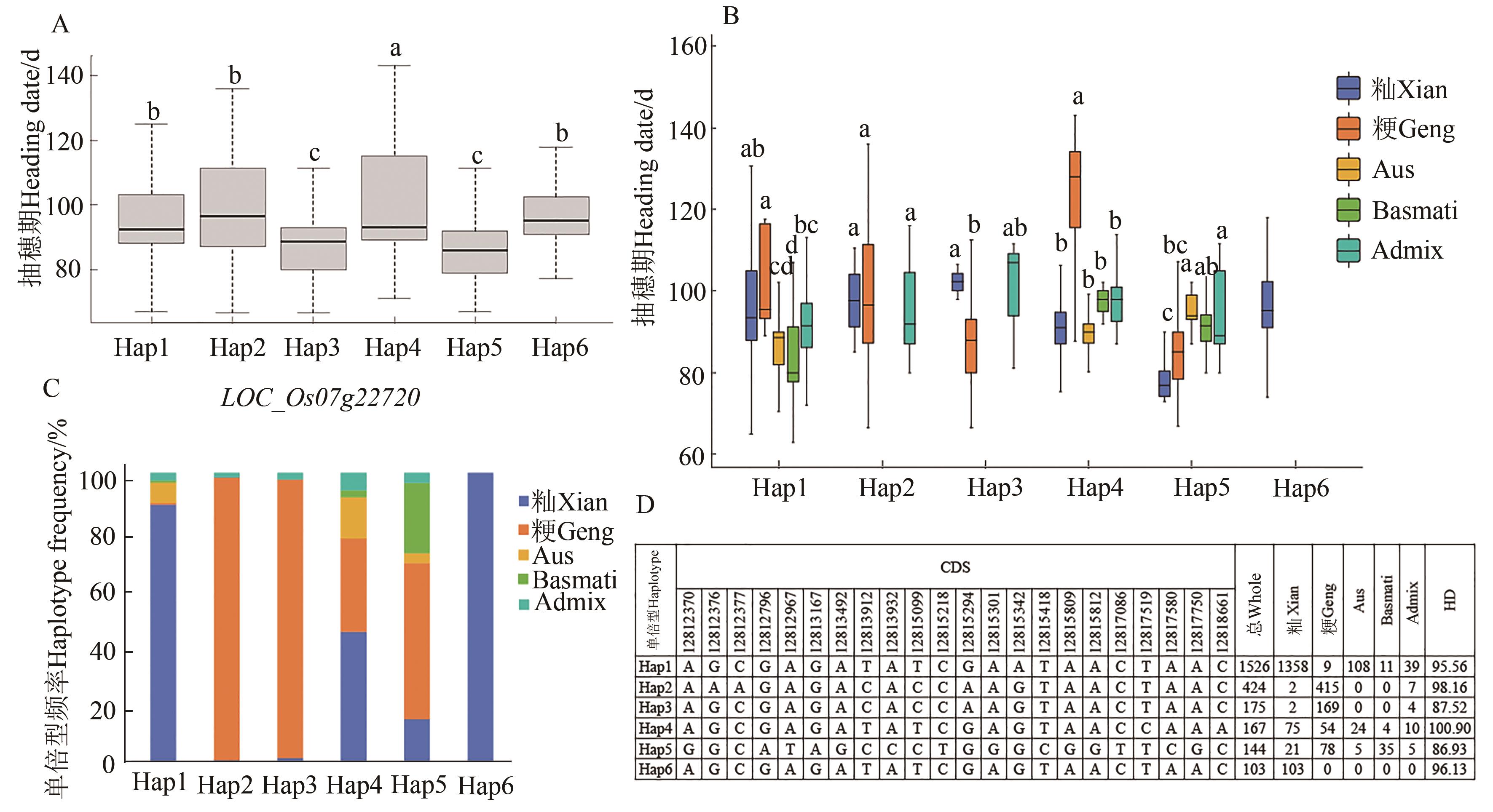 Fig. 6 LOC_Os07g22720 haplotype analysisA: Heading stage distribution of LOC_Os07g22720 haplotypes; B: Distribution of different haplotypes of LOC_Os07g22720 in subpopulations; C: Frequency of different haplotypes of LOC_Os07g22720 in subpopulations; D: Haplotypes of CDS region of LOC_Os07g22720. Different small letters indicate significant differences between haplotypes at P<0.05 level