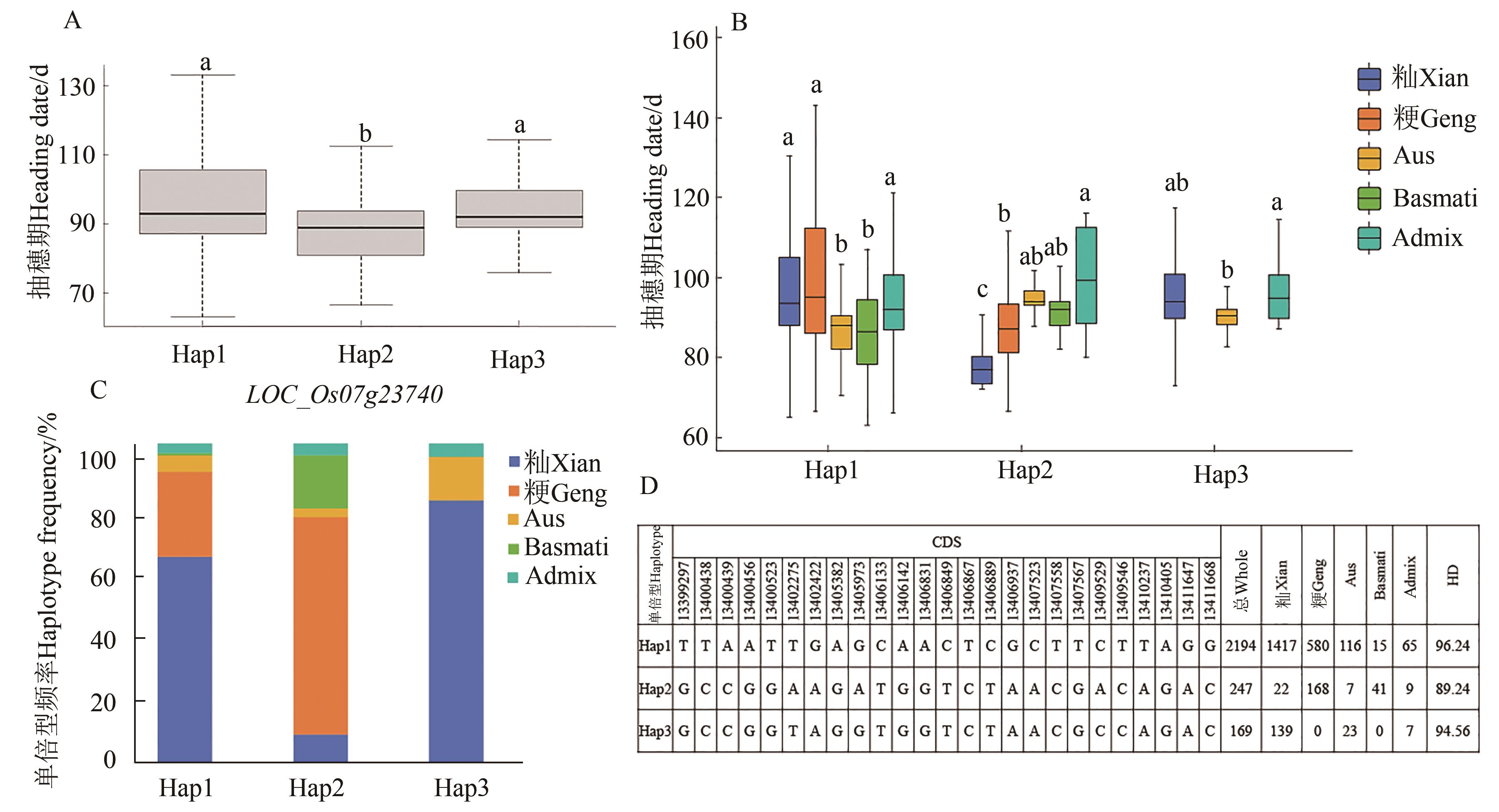 Fig. 7 LOC_Os07g23740 haplotype analysisA: Heading stage distribution of LOC_Os07g23740 haplotypes; B: Distribution of different haplotypes of LOC_Os07g23740 in subpopulations; C: Frequency of different haplotypes of LOC_Os07g23740 in subpopulations; D: Haplotypes of CDS region of LOC_Os07g23740. Different small letters indicate significant differences between haplotypes at P<0.05 level