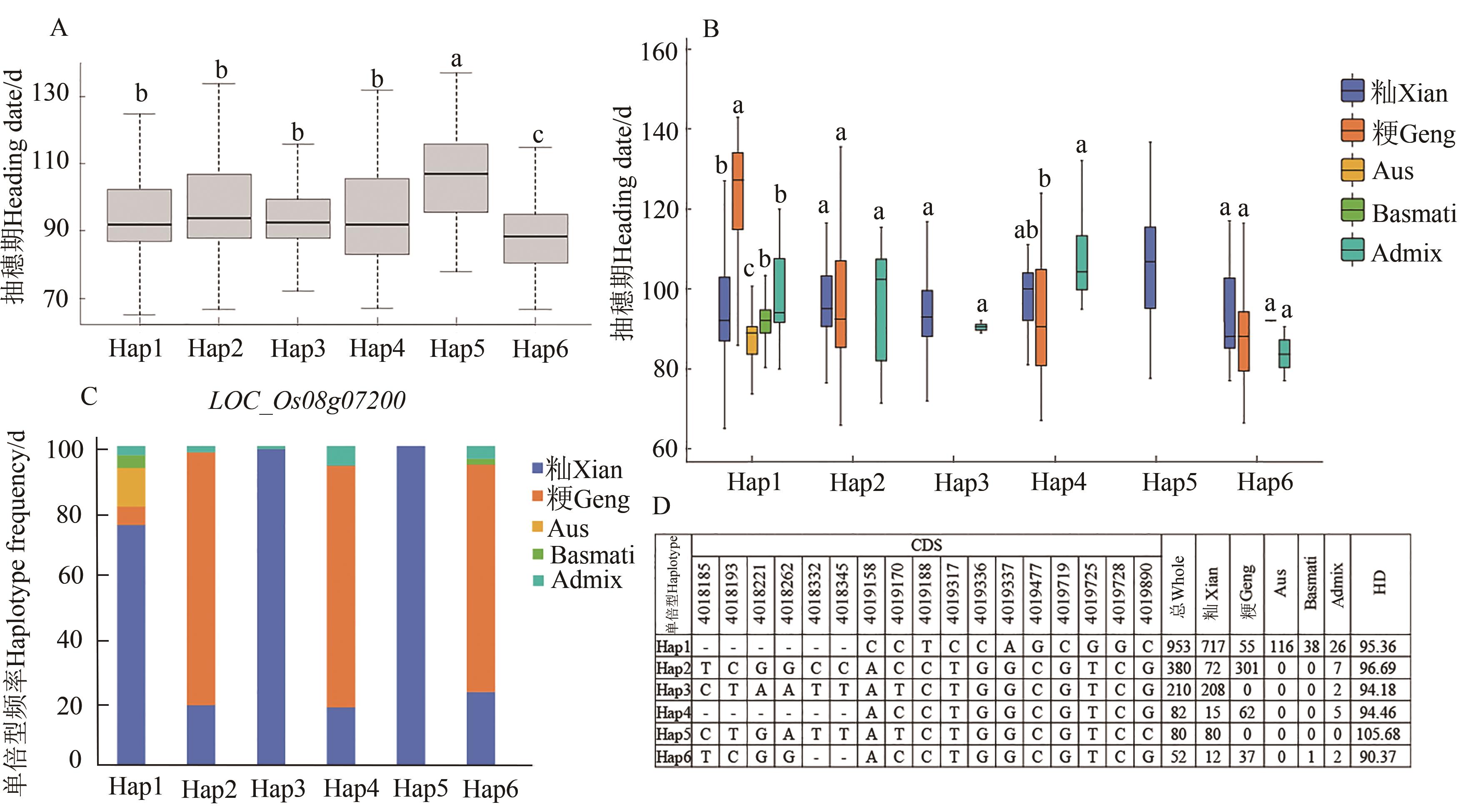Fig. 8 LOC_Os08g07200 haplotype significance analysisA: Heading stage distribution of LOC_Os08g07200 haplotypes; B: Distribution of different haplotypes of LOC_Os0g07200 in subpopulations; C: Frequency of different haplotypes of LOC_Os08g07200 in subpopulations; D: Haplotypes of CDS region of LOC_Os08g07200. Different small letters indicate significant differences between haplotypes at P<0.05 level