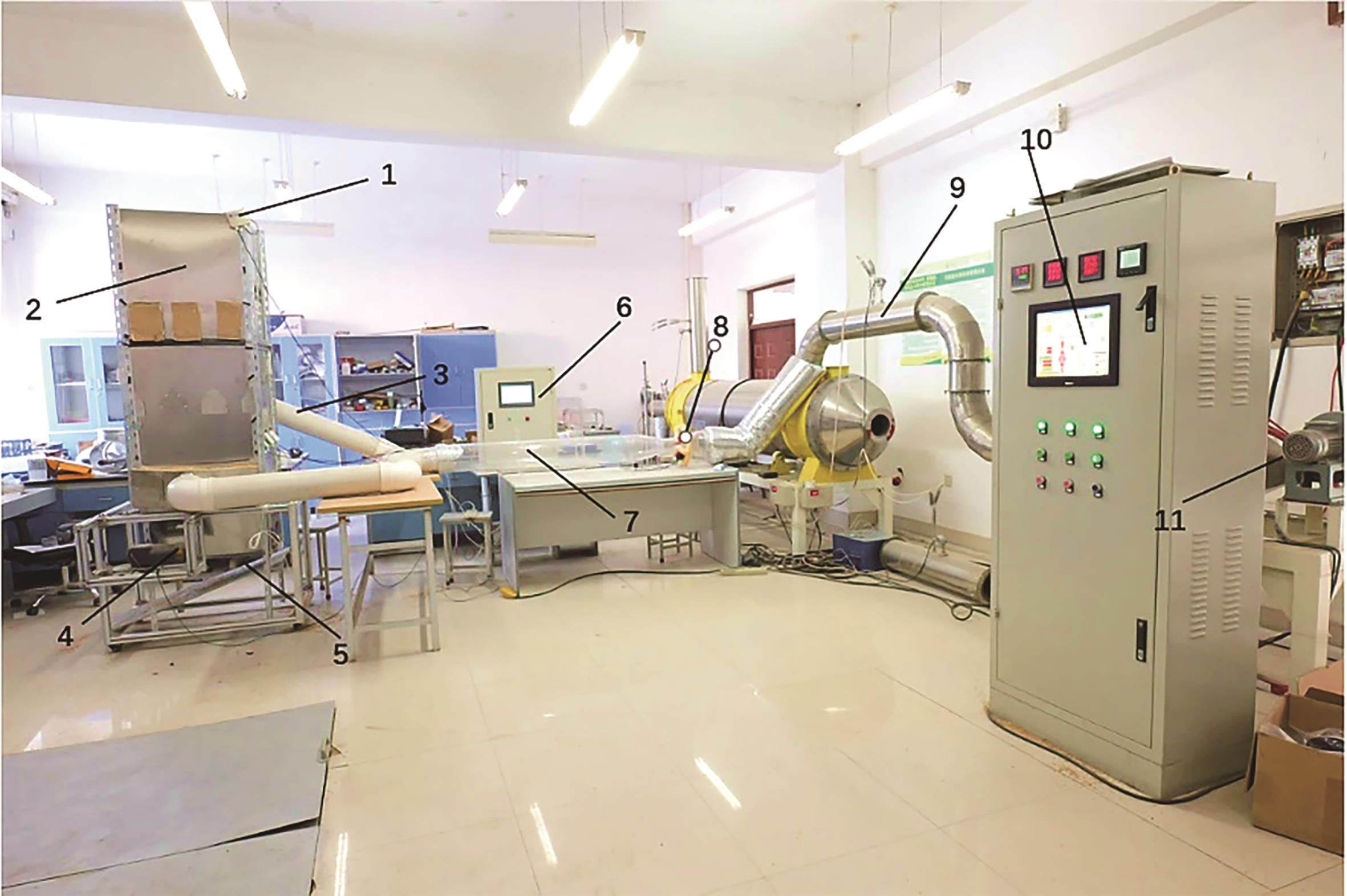Fig. 1 Mixed flow rice drying experimental deviceNote:1—Temperature and humidity sensor; 2—Mixed flow rice dryer; 3—Air inlet pipeline; 4—Grain discharge motor; 5—Unloading device; 6—Control system cabinet; 7—Mixing pipeline; 8—Mixing device; 9—Hot air pipeline; 10—Electric heating control cabinet; 11—Electric heating device.