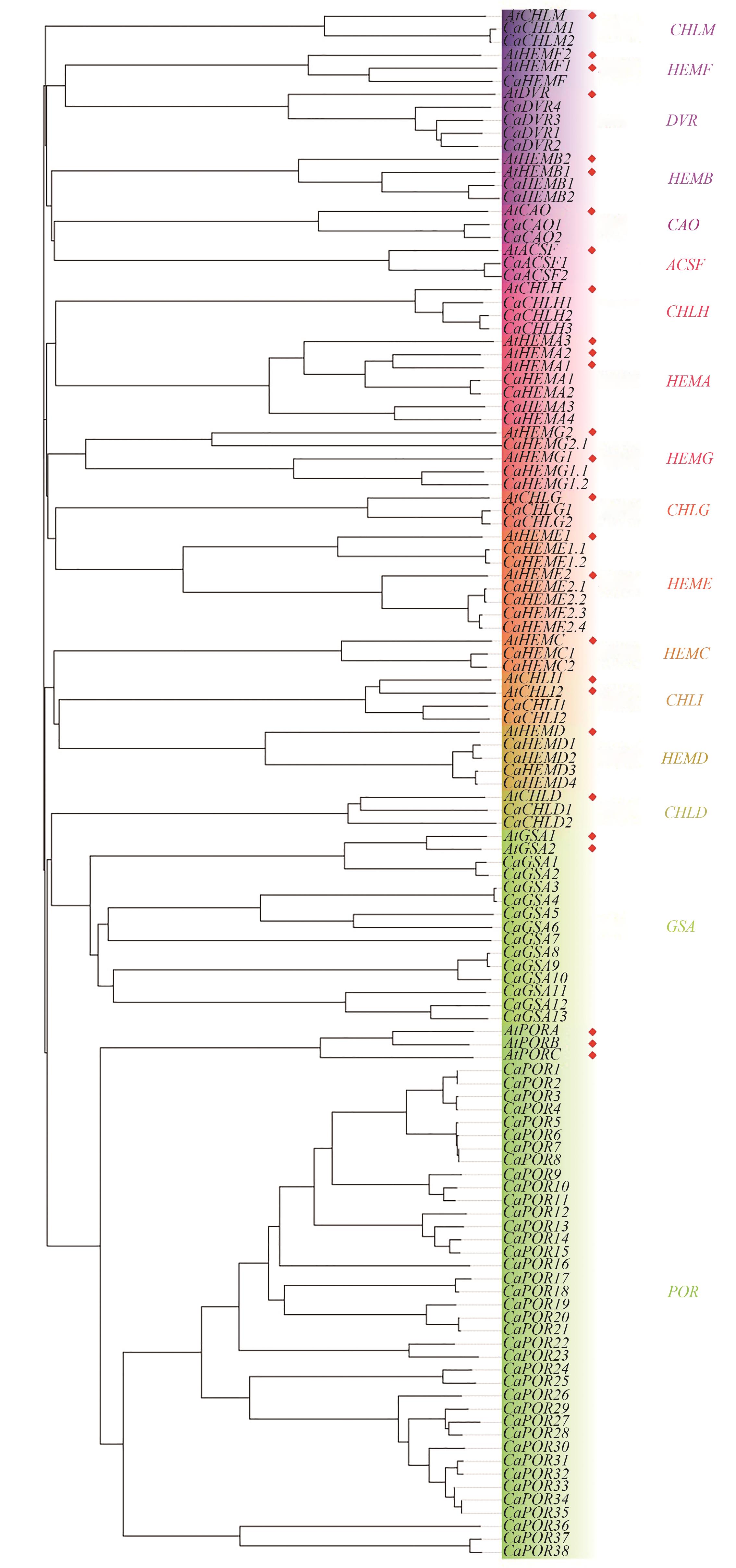 图1 拟南芥和小粒咖啡叶绿素合成相关基因的系统发生树注:At—拟南芥;Ca—小粒咖啡;红色菱形为突出标记拟南芥基因;不同颜色代表不同基因家族。