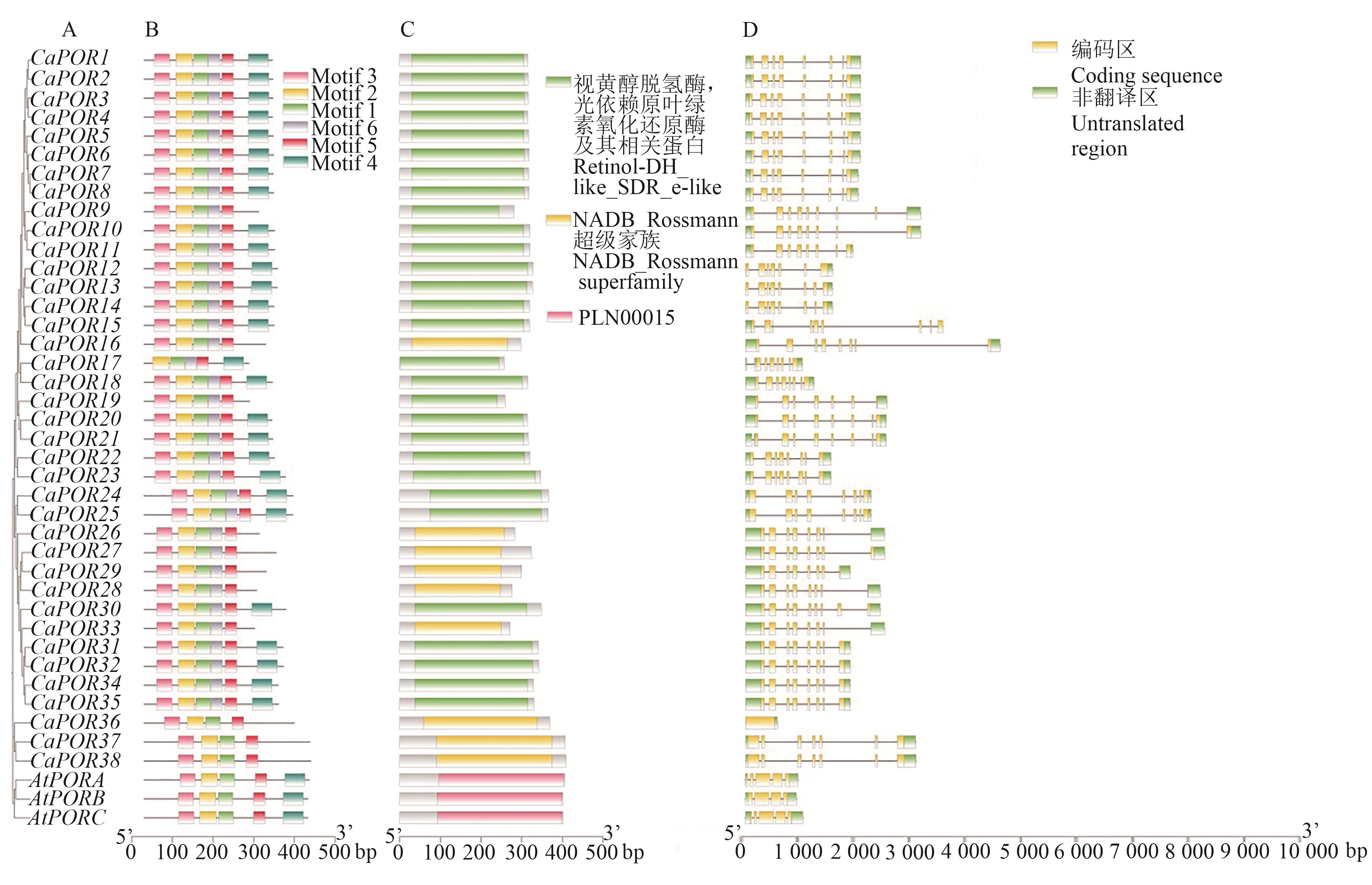 图4 小粒咖啡和拟南芥POR基因家族保守基序、结构域和基因结构A:系统发生树;B:保守基序;C:结构域;D:基因结构