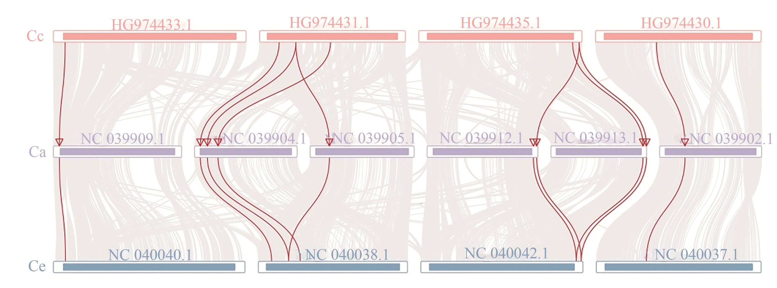 Fig. 7 Collinearity analysis of POR gene between Coffea arabica and parentsNote:Cc—Coffea canephora; Ca—Coffea arabica; Ce—Coffea eugenoedes.