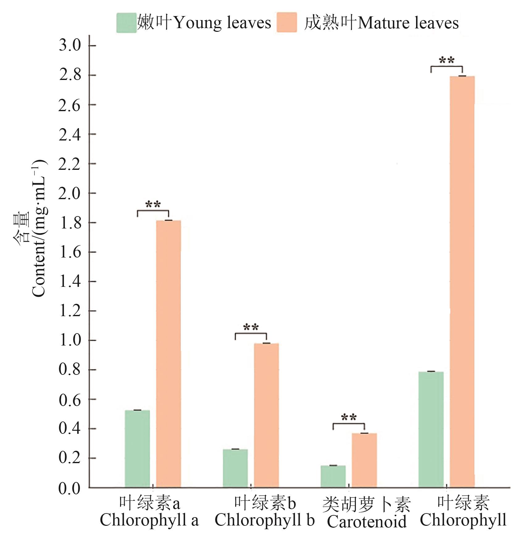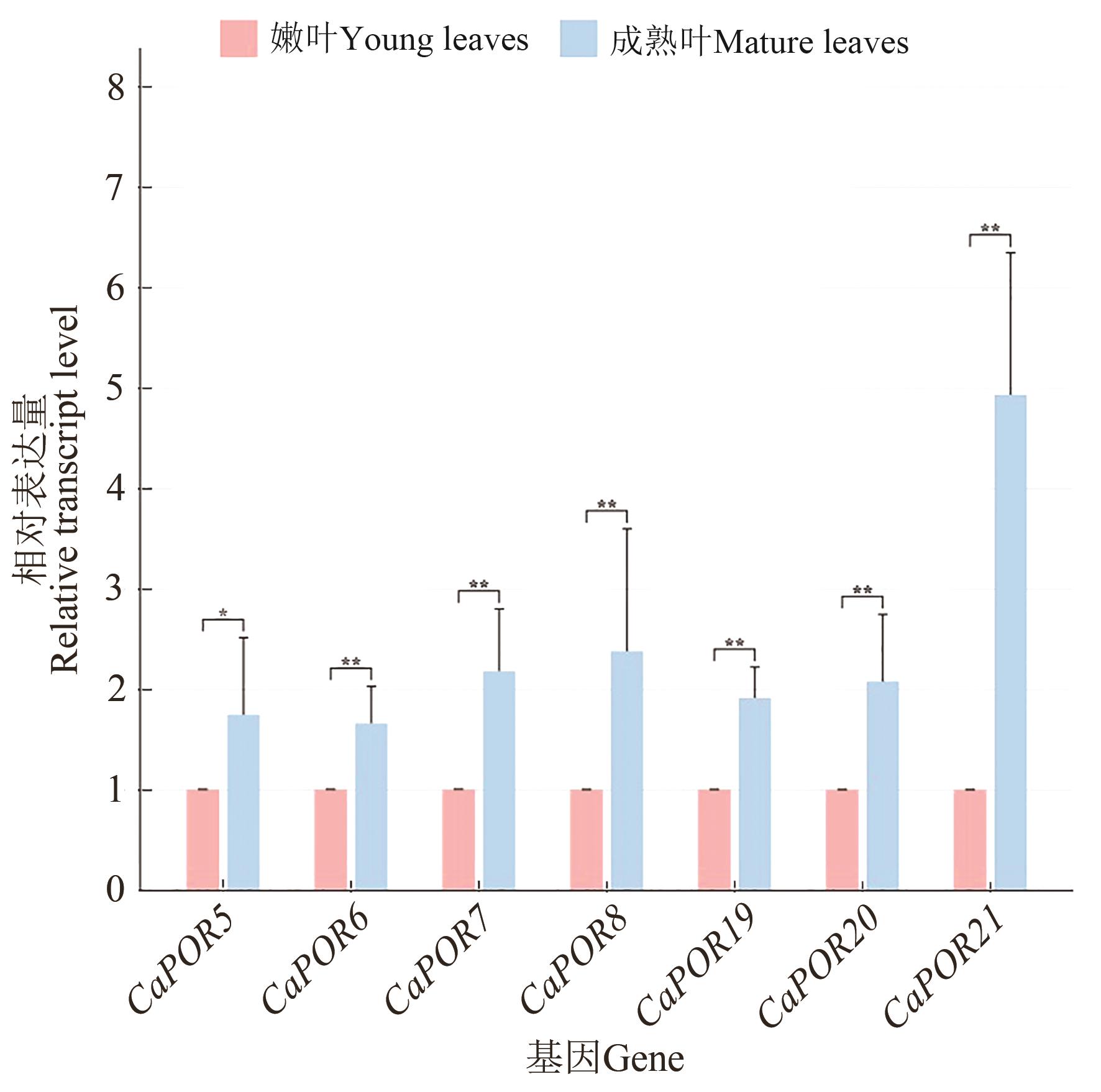 Fig. 12 Relative expression level of CaPOR gene in young and mature leaves of Coffea arabicaNote:* and ** indicate significant difference at P<0.05 and P<0.01 levels, respectively.