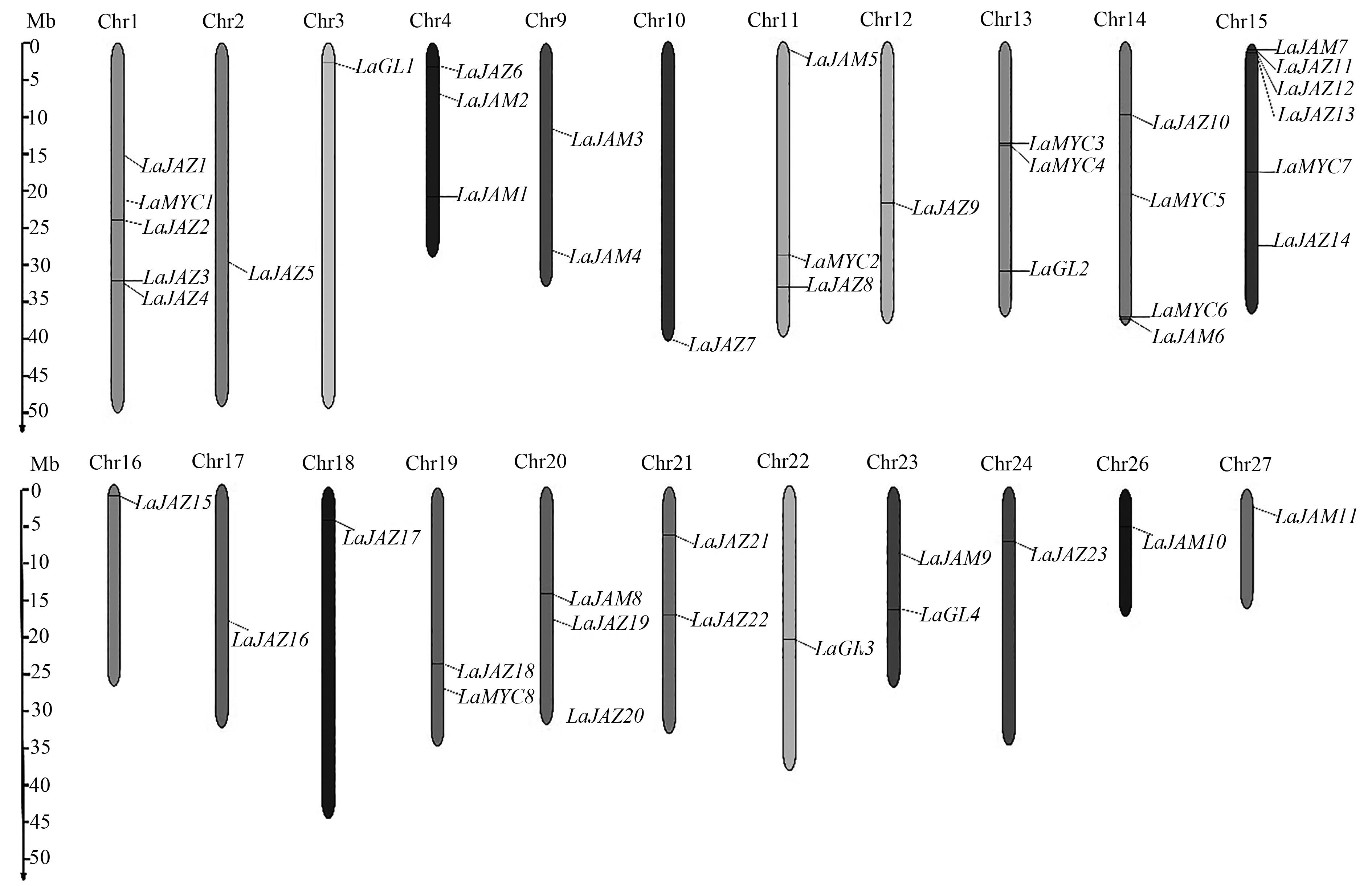 JAZ protein and MYC2-like transcription factor, which act as key regulators of the jasmonate (JA) signal transduction pathway, play important roles on plant growth and development and specialized metabolisms. Using the amino acid sequences of 13 JAZ proteins and 11 MYC2-like proteins from Arabidopsis thaliana as reference sequences, the LaJAZ and LaMYC2-like genes in the Lavandula angustifolia genome were retrieved and subjected to bioinformatics analysis. The results showed that a total of 26 LaJAZ and 26 LaMYC2-like genes were identified in whole genome of Lavandula angustifolia, which were unevenly distributed on 22 chromosomes. The promoter cis-acting elements of LaJAZ and LaMYC2-like genes involved plant responses to light, jasmonate, abscisic acid, defense and stress reactions. qRT-PCR showed that the selected 6 LaJAZ genes had higher express level in deep purple sepals, while the selected LaMYC2-like genes had higher express level in light purple sepals. In addition, 15 LaJAZ and LaMYC2-like genes were induced by methyl jasmonate (MeJA). Above results laid the foundation for the functional analysis of LaJAZ and LaMYC2-like genes in Lavandula angustifolia and their response mechanism to JA signaling.