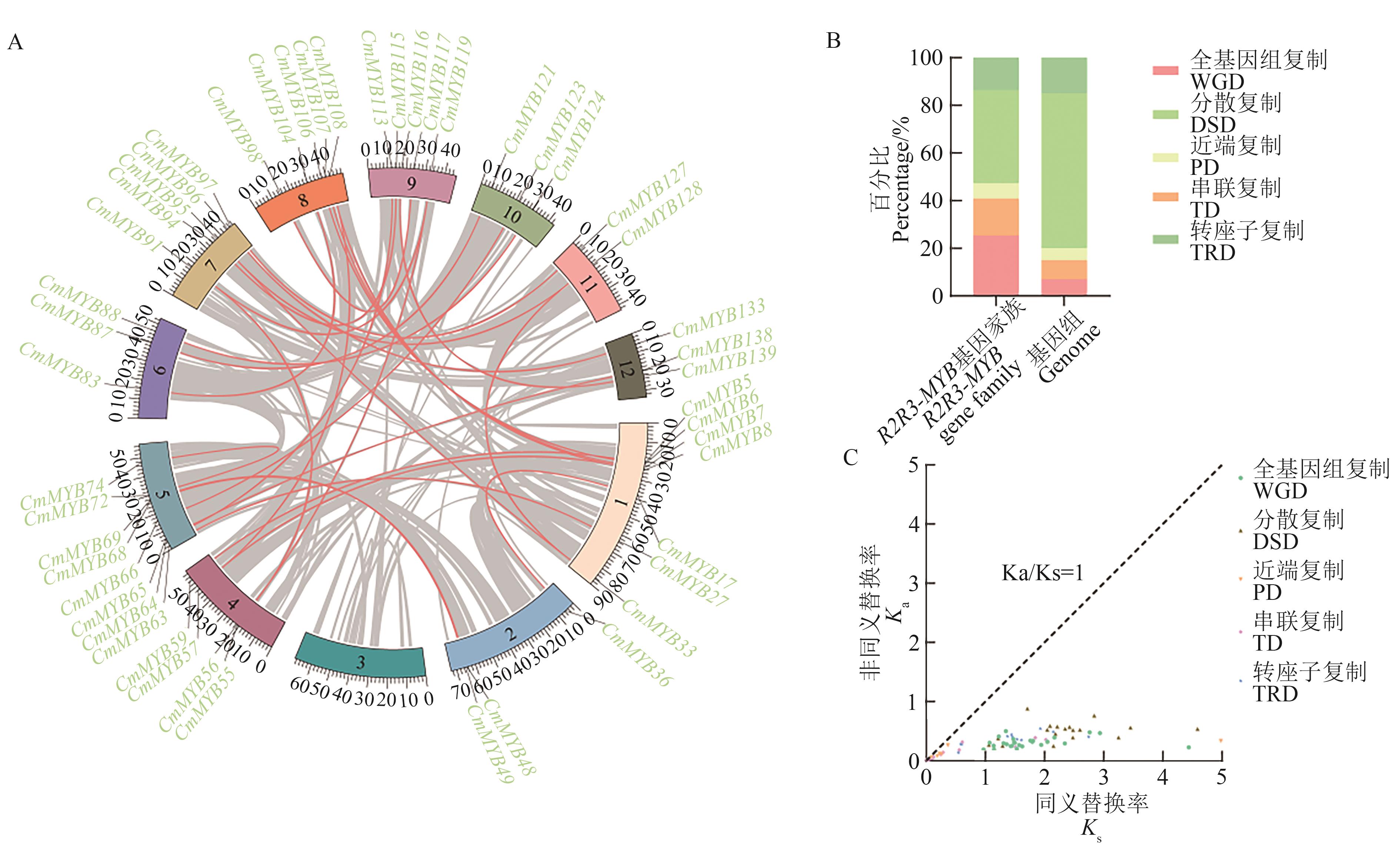 Fig. 6 Collinearity analysis among CmR2R3-MYB gene family members and duplication typesA; Collinearity in genome; B: Type of gene family duplications; C: Replacement rate