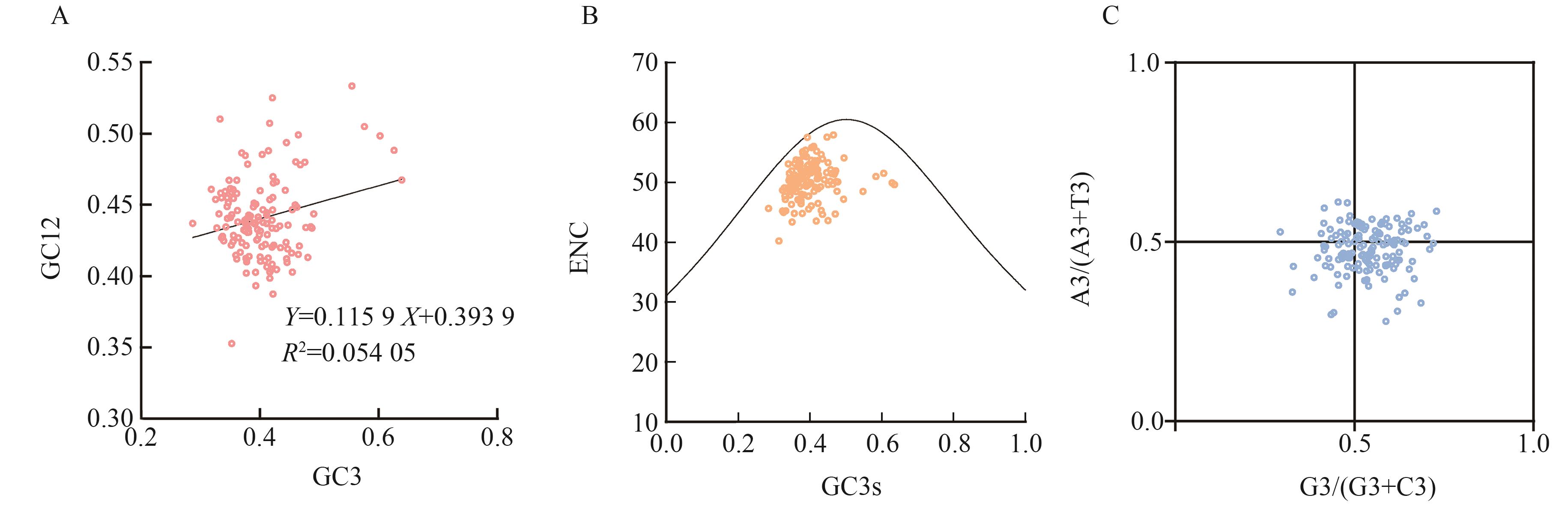 图9 CmR2R3-MYB基因家族密码子偏好性分析A:中性绘图分析;B:ENC-plot分析;C:PR2-plot分析
