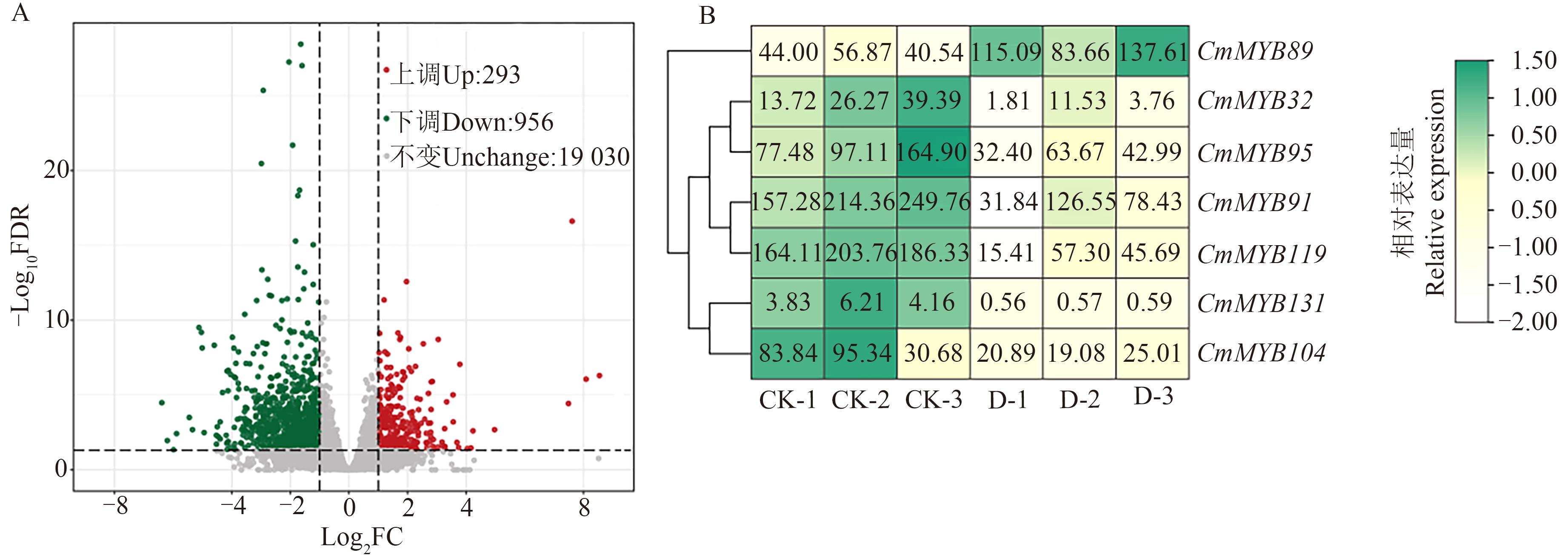 图10 干旱胁迫下CmR2R3-MYB转录组分析A:干旱胁迫后转录组分析的火山图;B:CmR2R3-MYB基因家族中差异表达基因的表达热图