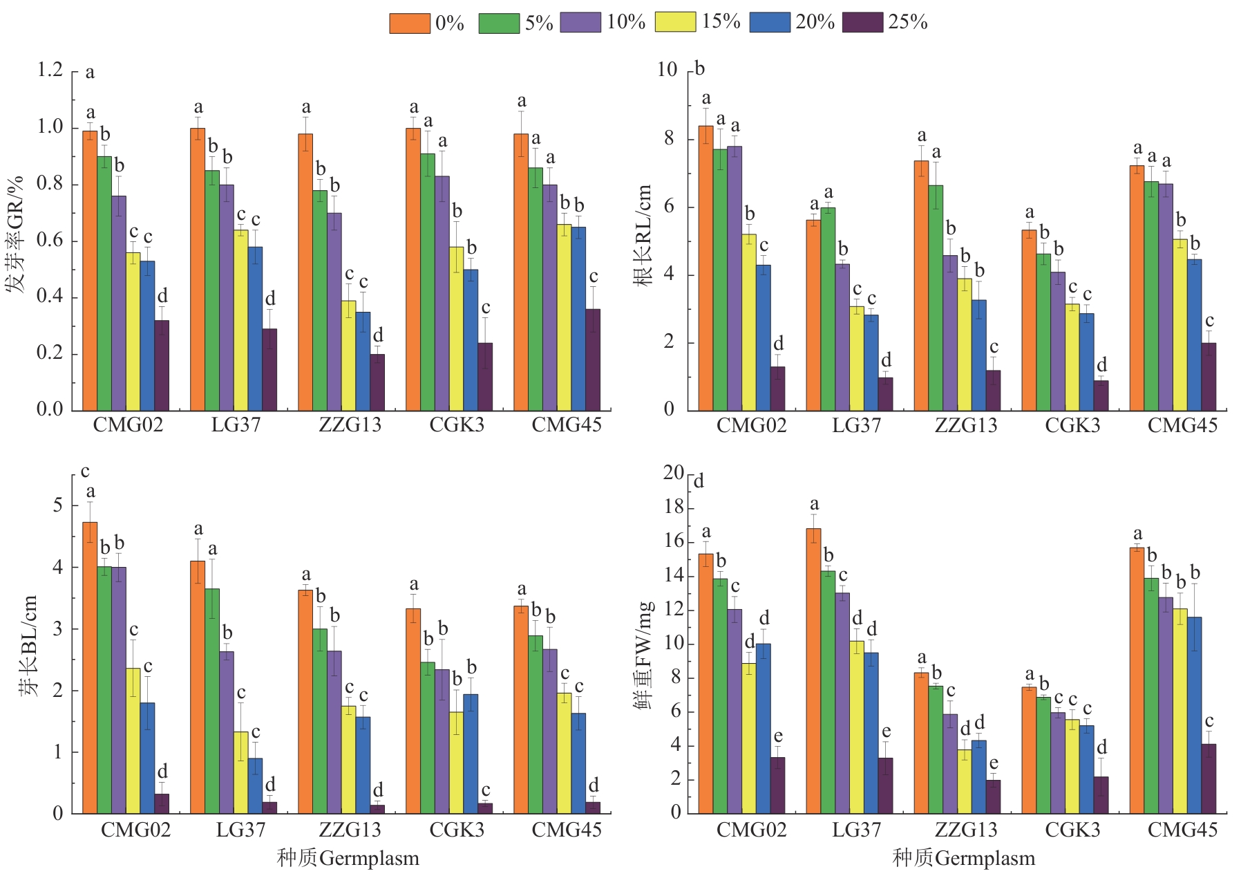 Fig. 1 GR, RL, BL and FW of millet under different PEG-6000 treatmentsNote: Different lowercase letters indicate significant differences between different treatments at P<0.05 level.
