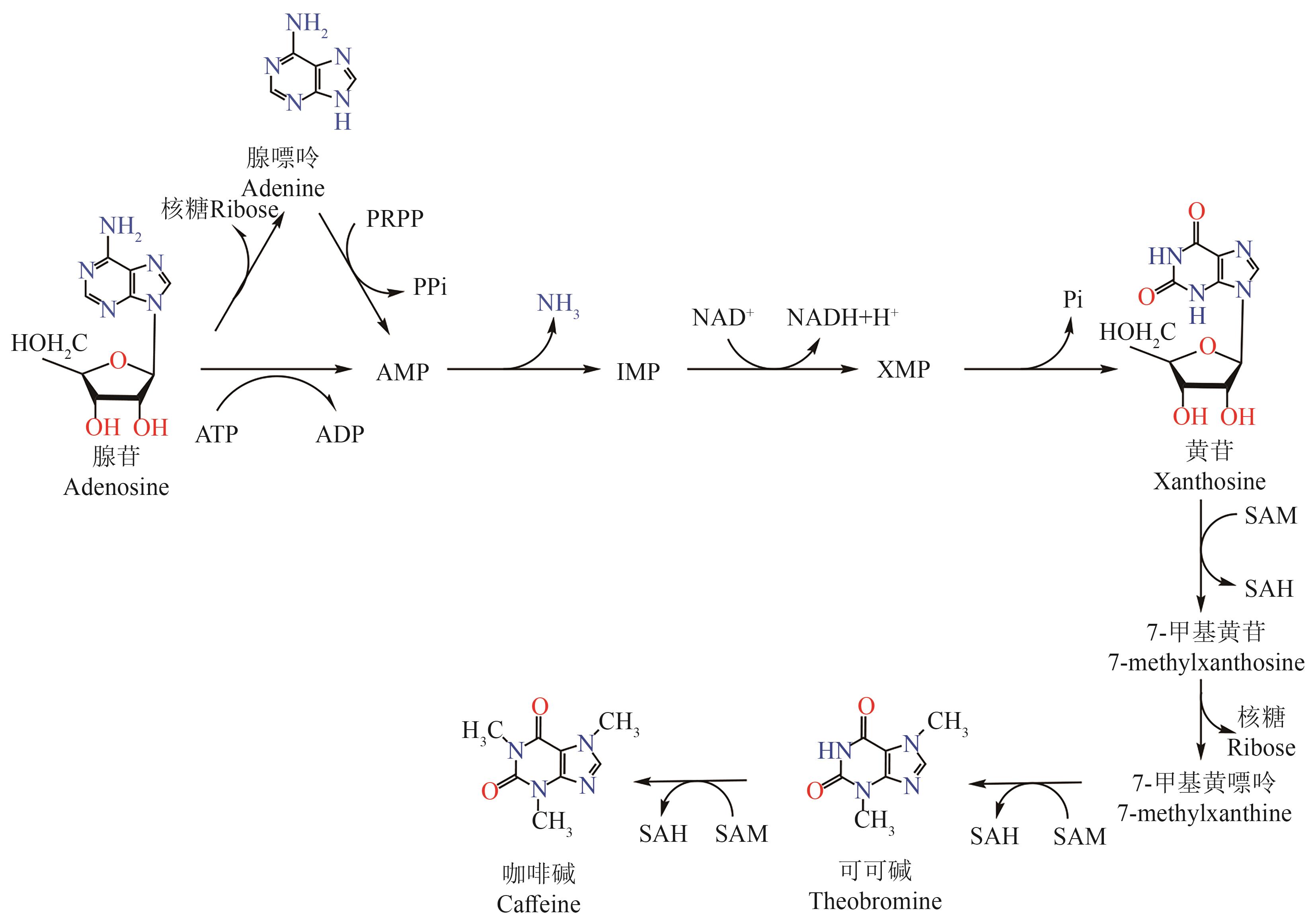 图2 咖啡碱生物合成途径[45]注:AMP—腺苷一磷酸;IMP—肌苷酸;XMP—单磷酸黄嘌呤;PRPP—5-磷酸核糖-1α-焦磷酸;PPi—蛋白质交互作用;ATP—三磷酸腺苷;ADP—二磷酸腺苷;NAD+—烟酰胺腺嘌呤二核苷酸;NADH+—还原型烟酰胺腺嘌呤二核苷酸;Pi—无机磷酸盐;SAM—S-腺苷蛋氨酸;SAH—S-腺苷高半胱氨酸。
