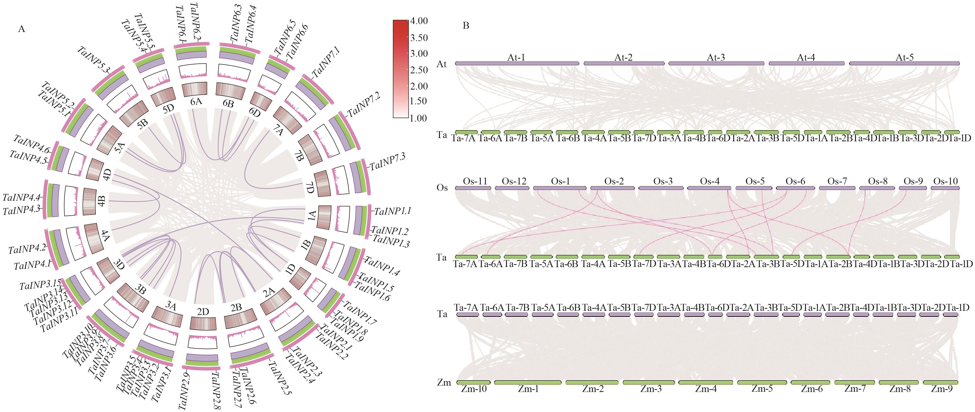 图3 INP1基因的共线性分析A:小麦TaINP1基因在A、B、D染色体的共线性分析;B:小麦TaINP1基因与水稻、拟南芥、玉米的共线性分析。Ta—小麦;Zm—玉米;Os—水稻;At—拟南芥