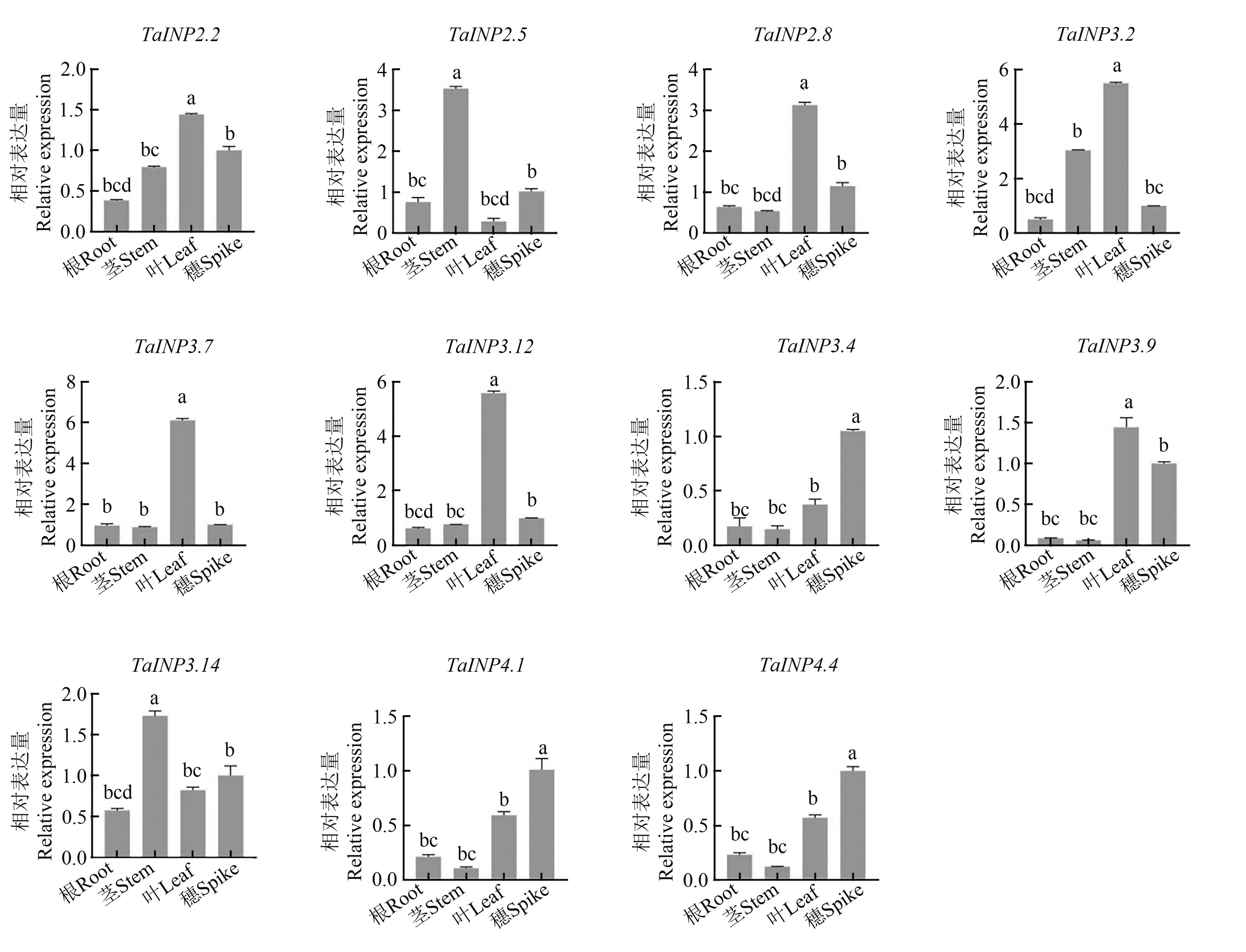 图5 TaINP1基因在小麦不同组织中的表达注:不同小写字母表示不同器官间在P<0.05水平差异显著。