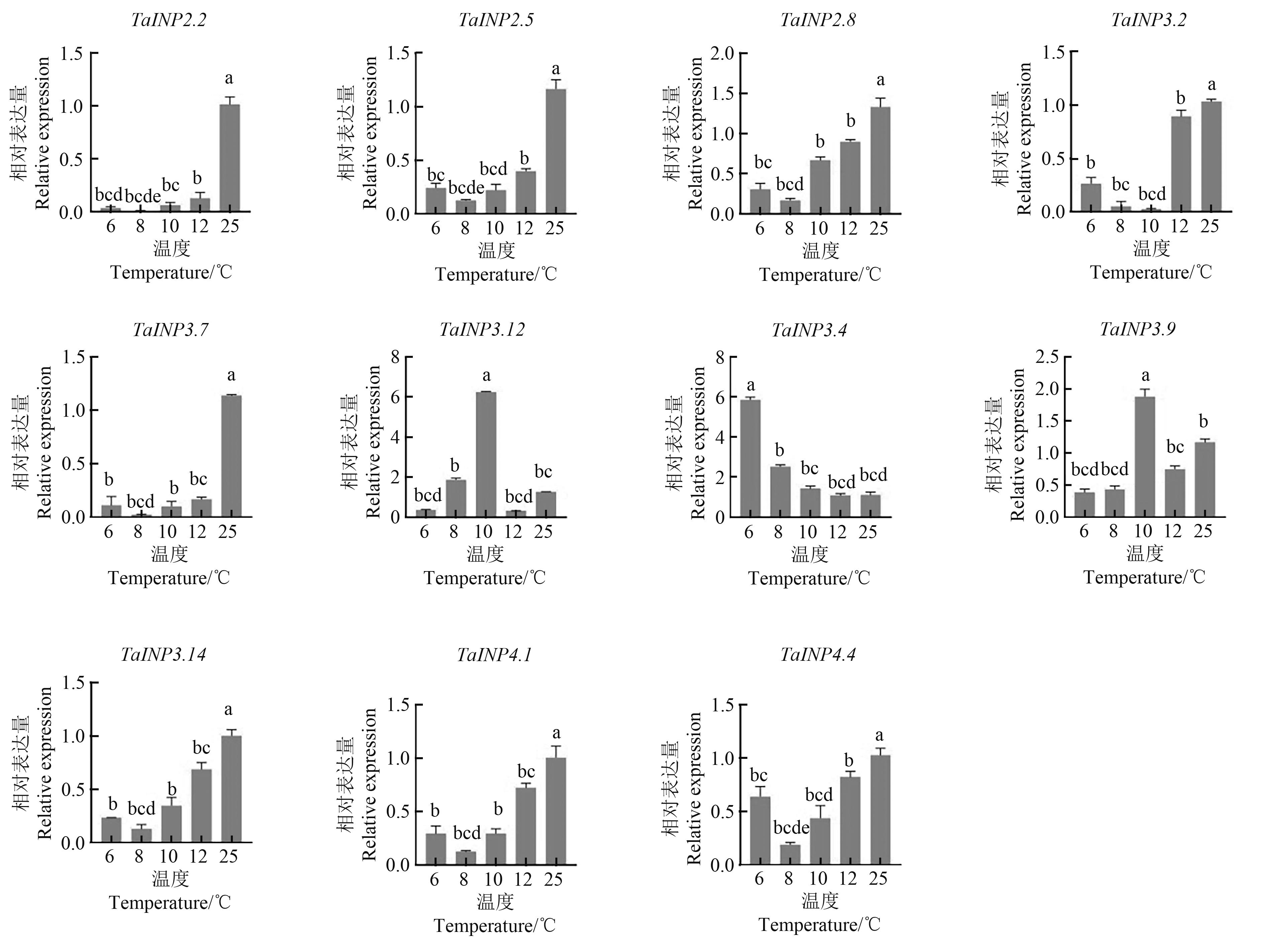 Fig. 6 Expression of TaINP1 genes in pollen under low temperature treatmentNote:Different lowercase letters indicate significant differences between different temperatures at P<0.05 level.