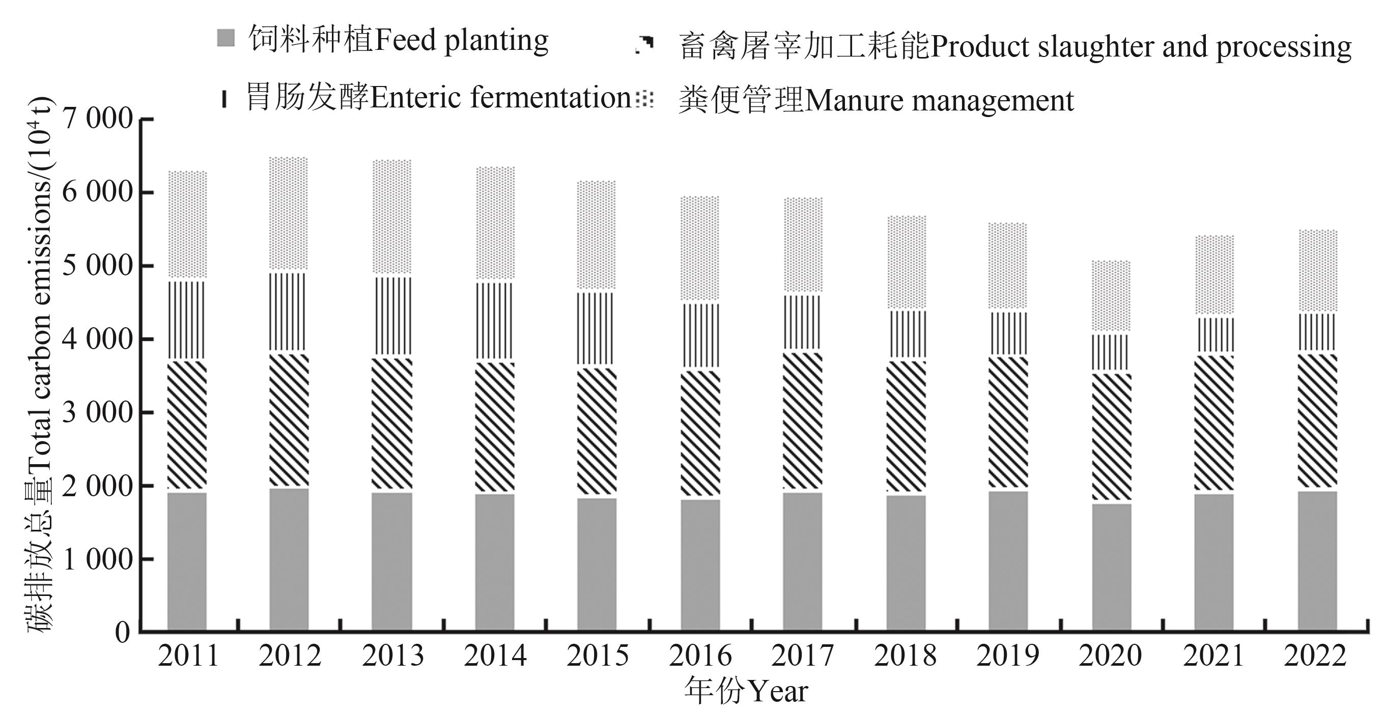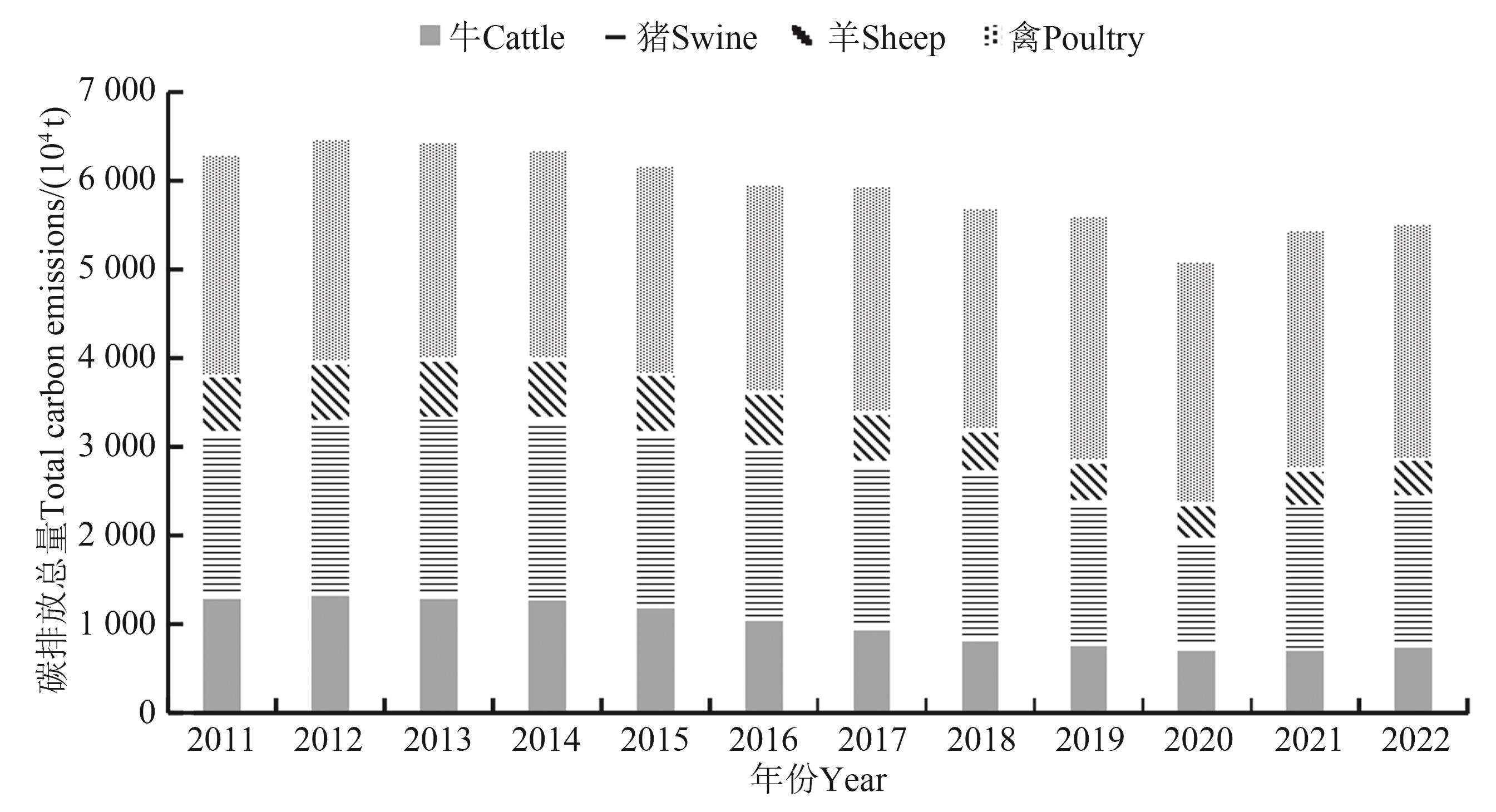 Fig. 3 Total carbon emission of all livestock breeds in Shandong province from 2011 to 2022Note: Because rabbits have carbon emissions of rabit is relatively low, and is it negligible to other livestock species, it is not listed in the figure.