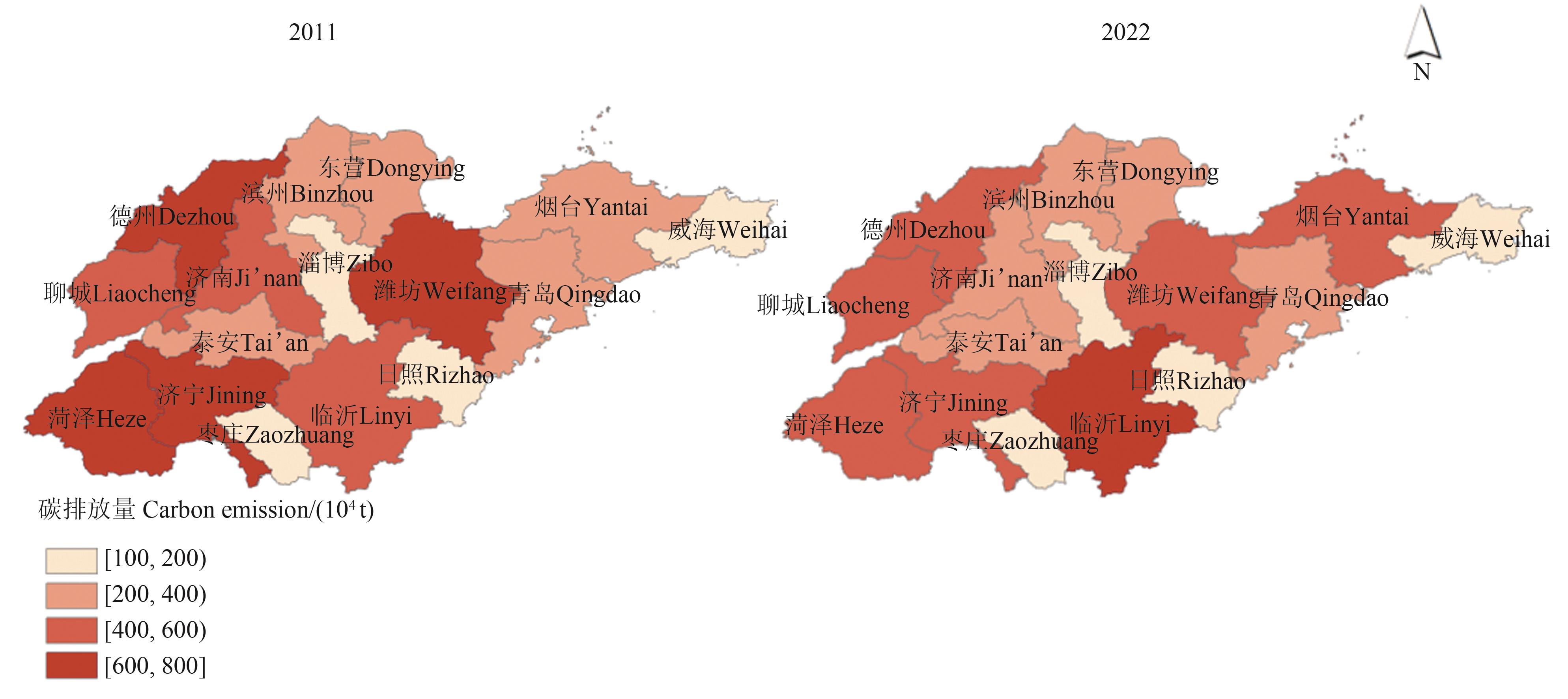Fig. 4 Spatial distribution diagram of carbon emission from animal husbandry in Shandong provinceNote:Based on the standard map GS(2024)1158 of the National Resources Ministry’s standard map service website, the base map has not been modified.