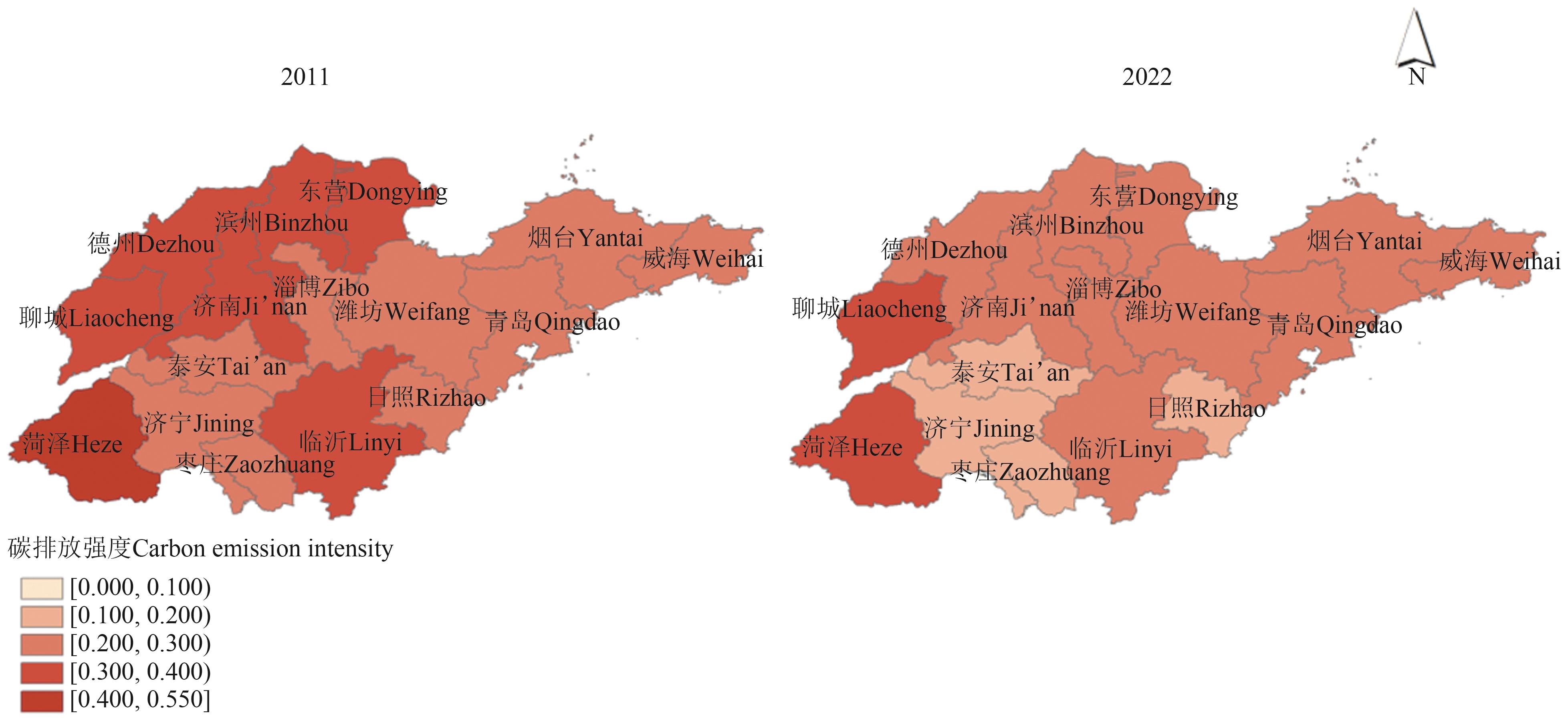 Fig. 5 Spatial distribution diagram of carbon emission intensity in animal husbandry in Shandong provinceNote:Based on the standard map GS(2024)1158 of the National Resources Ministry’s standard map service website, the base map has not been modified.