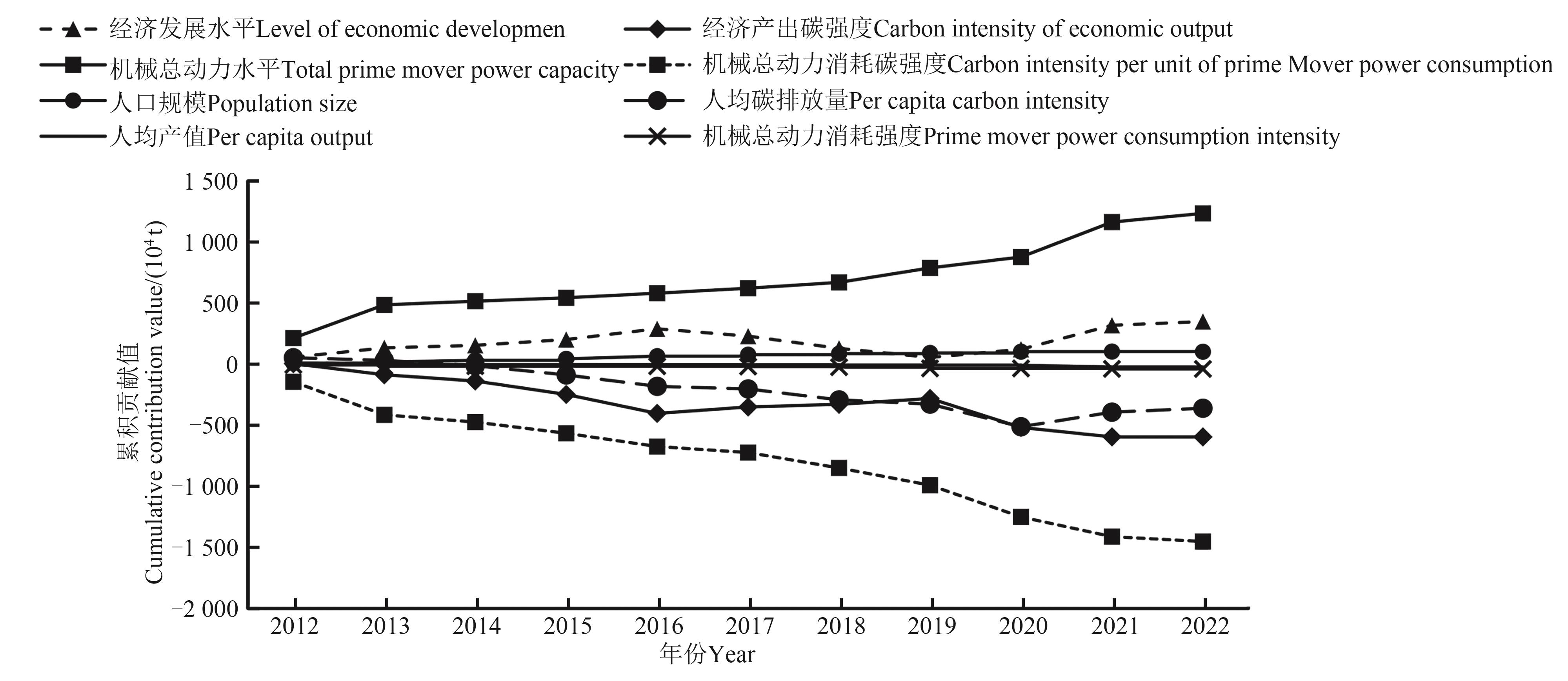Fig. 6 Cumulative contribution values of the factors affecting carbon emissions in Shandong Province from 2012 to 2022Note: The cumulative contribution value is based on 2011, and the contribution value of each factor to the carbon emission of animal husbandry in Shandong province is added up year by year.