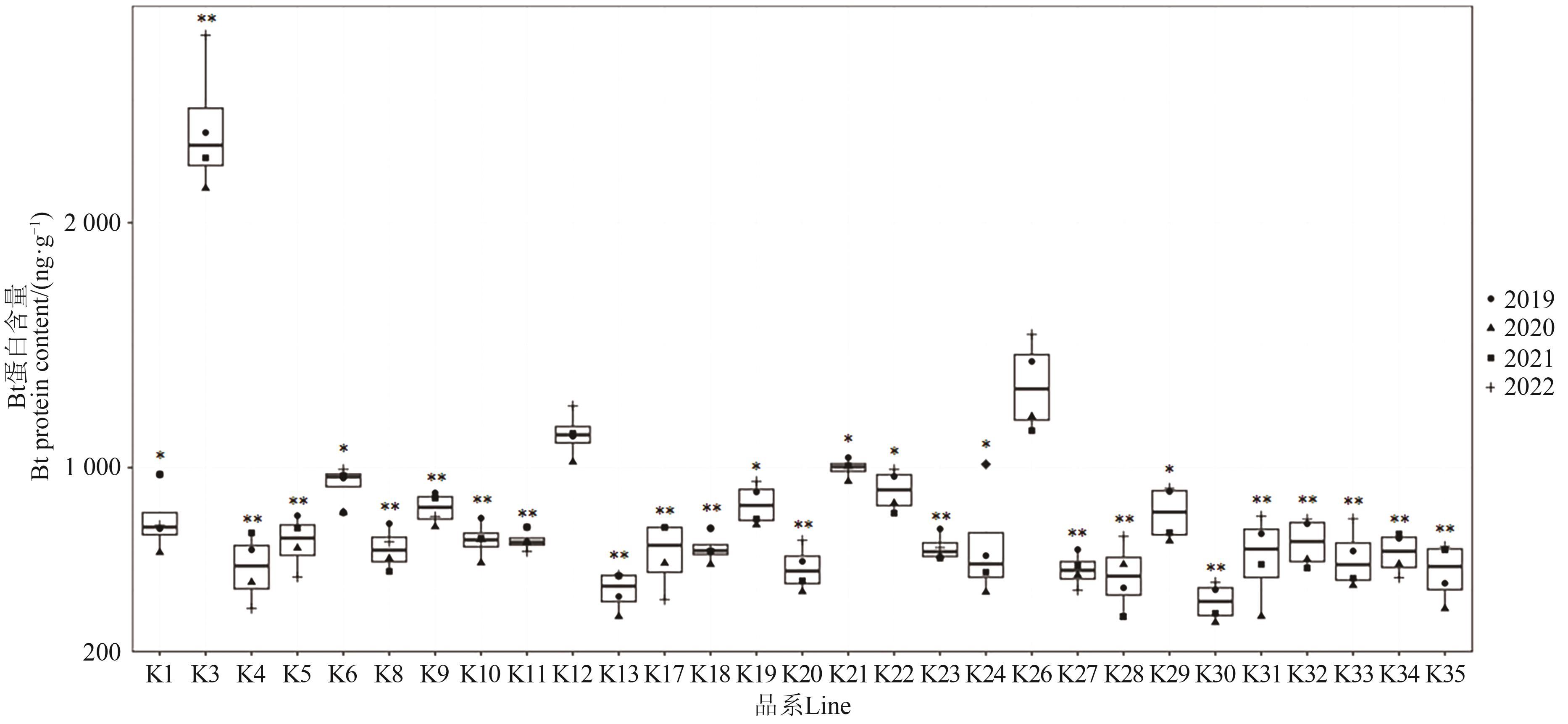 Fig. 1 Bt protein content in different insect-resistant cotton lines from 2019 to 2022Note:* and ** indicate significant differences with K26 (Xinmian 33B) at P<0.05 and P<0.01 levels, respectively.