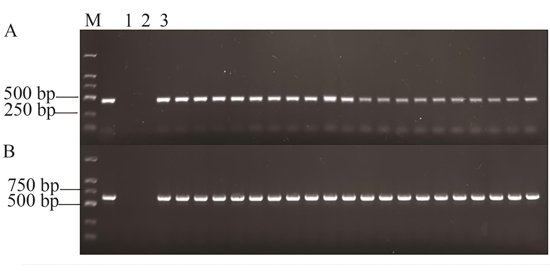 图3 A02染色体插入位点检测A: A02-LB引物检测结果;B: A02-RB检测结果。1—水;2—K3;3—新棉33B;M—DL2000 DNA marker;其余甬道为其他品系