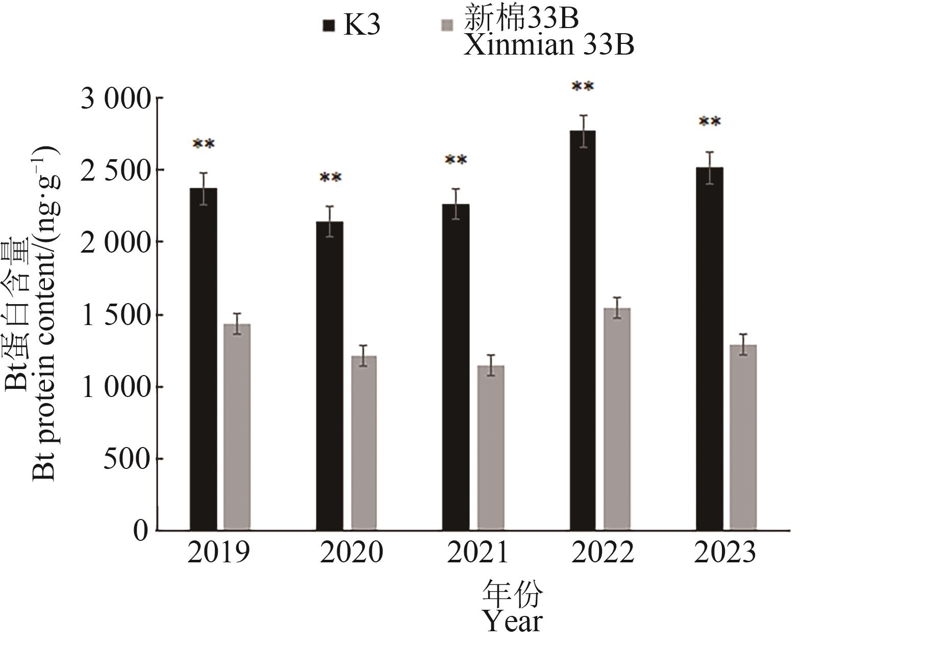 图4 2019—2023年K3与新棉33B Bt蛋白含量注:**表示K3和新棉33B间在P<0.01水平差异显著。