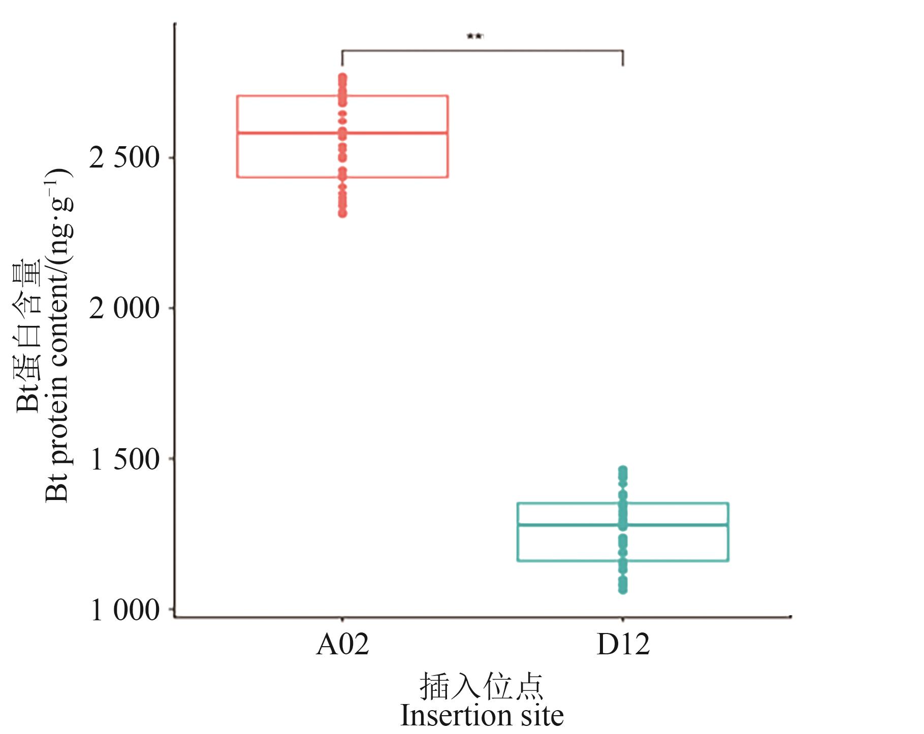 外源基因的插入位点能影响受体材料的基因表达及性状表现。为明确外源基因插入位点对抗虫棉Bt蛋白含量的影响,选用29个抗虫棉品系进行Bt蛋白含量测定以及全基因组重测序分析。结果表明,不同品系间的Bt蛋白含量存在显著差异,其中K3品系蛋白含量最高。通过全基因组重测序分析和PCR鉴定发现,Bt基因在29个品系均为单拷贝但插入位点存在差异,其中K3品系的Bt基因位于A02染色体2 791 303~2 791 335 bp(A02型),而其他品系的Bt基因则位于D12染色体(D12型)。为进一步验证插入位点对Bt蛋白含量的影响,利用K3品系与对照新棉33B进行杂交并构建F2群体,进一步分析F2群体的Bt蛋白含量发现,Bt基因插入位点位于A02染色体的F2单株(A02型)Bt蛋白含量极显著高于D12型单株。综上所述,Bt抗虫蛋白含量受插入位点影响,其位于A02染色体更利于Bt基因的高效表达。以上结果可为培育抗虫棉新品种提供种质资源和理论支撑。