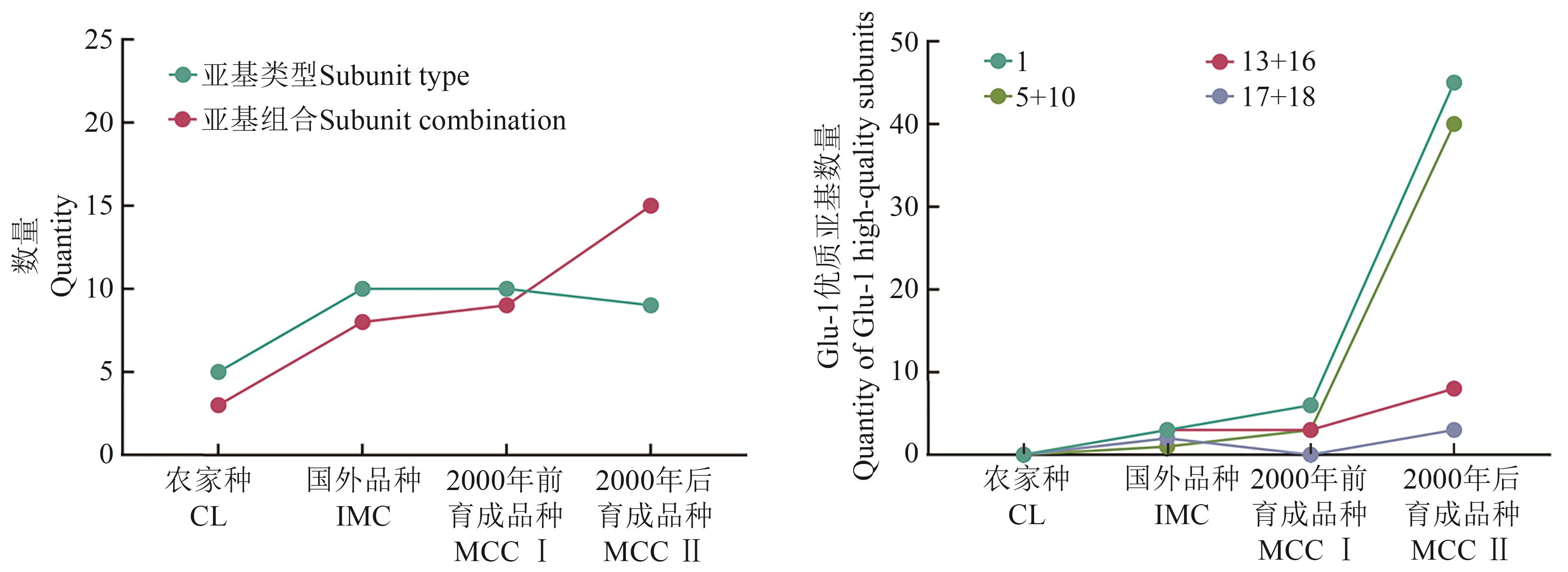 亚基组合 Subunit combination | 总计Total | 农家种CL | 国外品种IMC | 2000年前育成品种MCC Ⅰ | 2000年后育成品种MCC Ⅱ | 评分Score | ||||||
