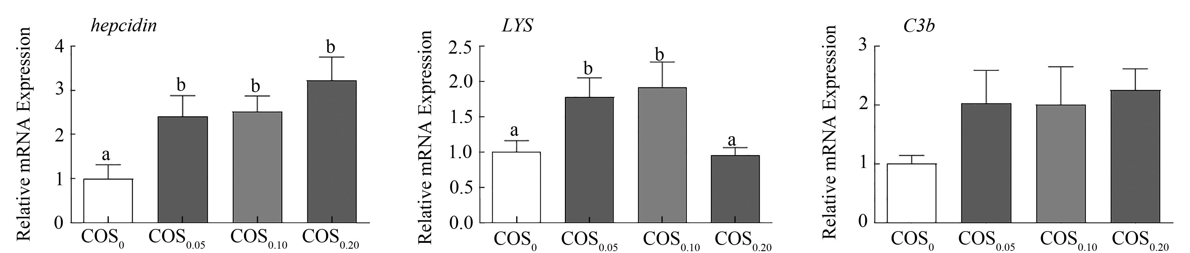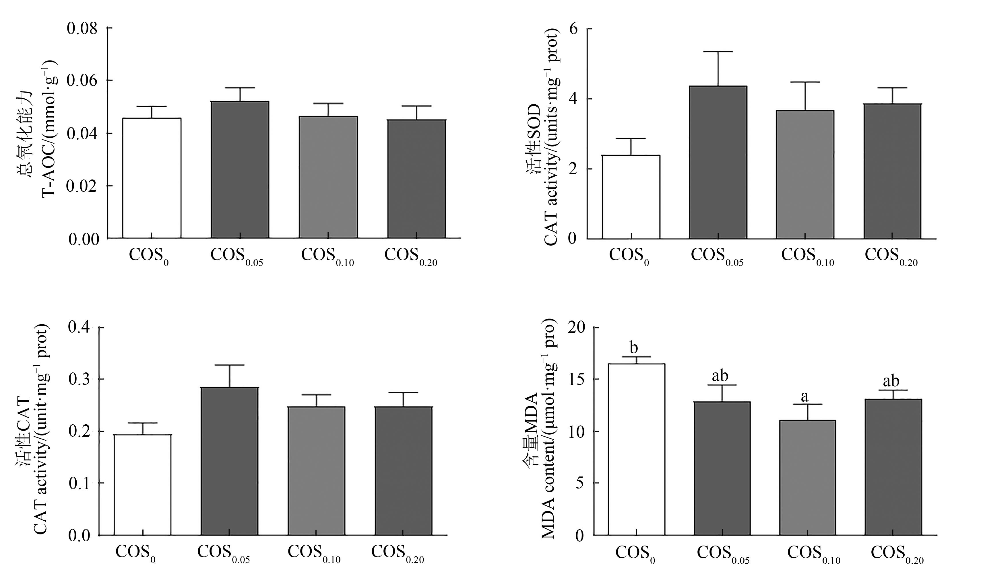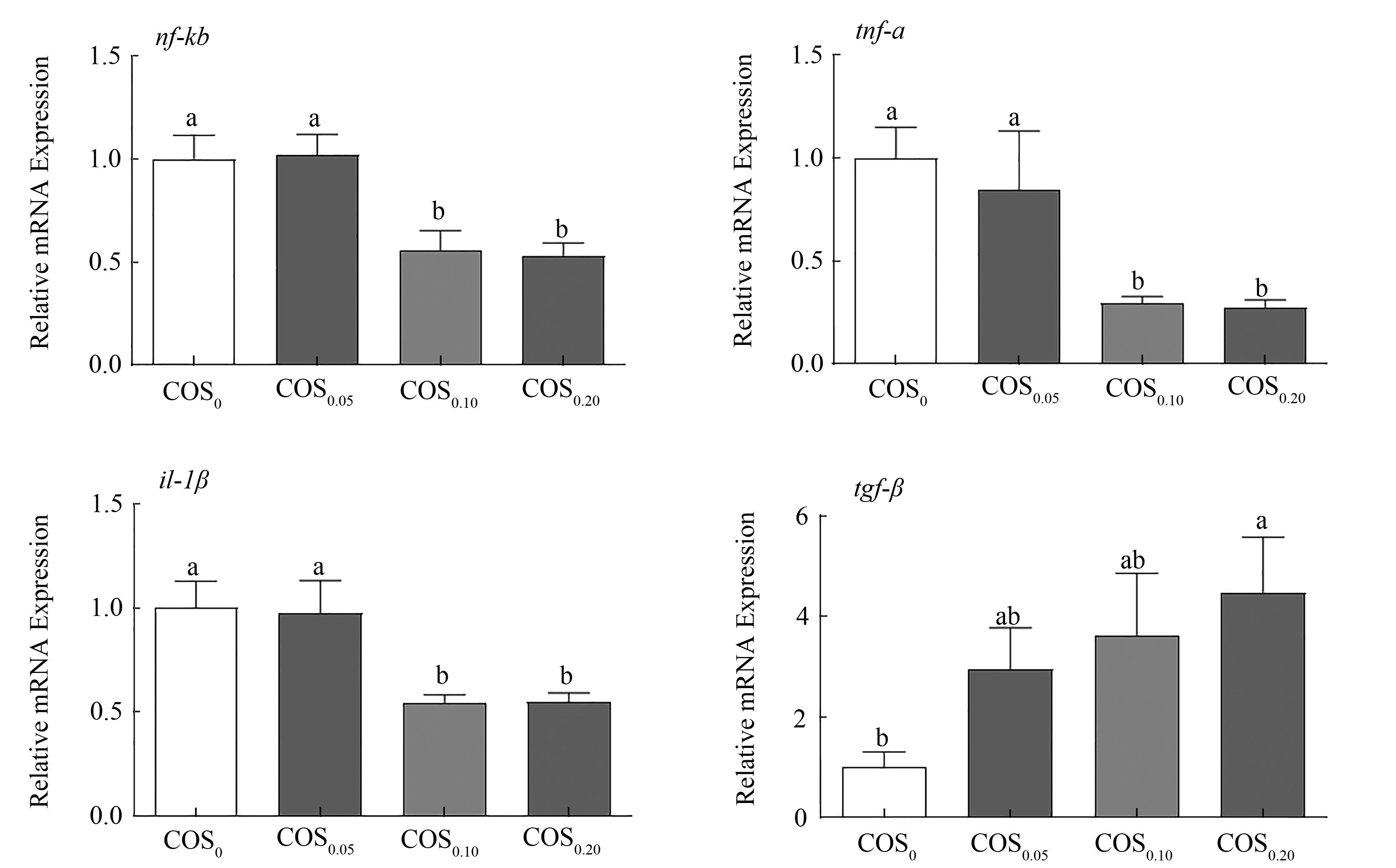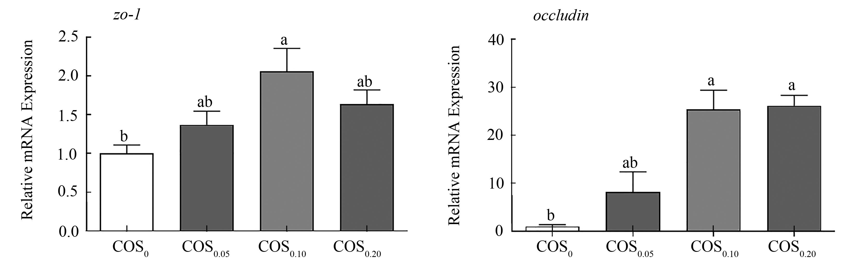 为探究饲料中添加壳寡糖对斑马鱼肝肠健康和抗病力的影响,设置添加质量分数0(对照)、0.05%、0.10%和0.20%壳寡糖4个处理,开展了28 d的养殖实验。结果表明,饲喂壳寡糖对斑马鱼的生长影响不显著(P>0.05)。但是,饲喂壳寡糖提高了斑马鱼的抗氧化能力,显著降低了肝脏和肠道中丙二醛的含量(P<0.05);同时提高了肠道中抗炎因子基因(转化生长因子tgf-β)的表达,并且显著降低了促炎因子基因(核转录因子nf-κb、肿瘤坏死因子tnf-α和白介素il-1β)的表达。此外,饲喂壳寡糖提高了斑马鱼肠道中铁调素(hepcidin)、溶菌酶(LYS)、闭锁小带蛋白-1(zo-1)和闭合蛋白(occludin)基因的表达,以及在病原菌感染后的存活率。上述结果表明,饲料中添加0.10%的壳寡糖提高了斑马鱼的非特异性免疫,改善了肝、肠健康以及抗维氏气单胞菌感染的能力,为壳寡糖安全、高效地在水产养殖中的推广与利用提供了参考。