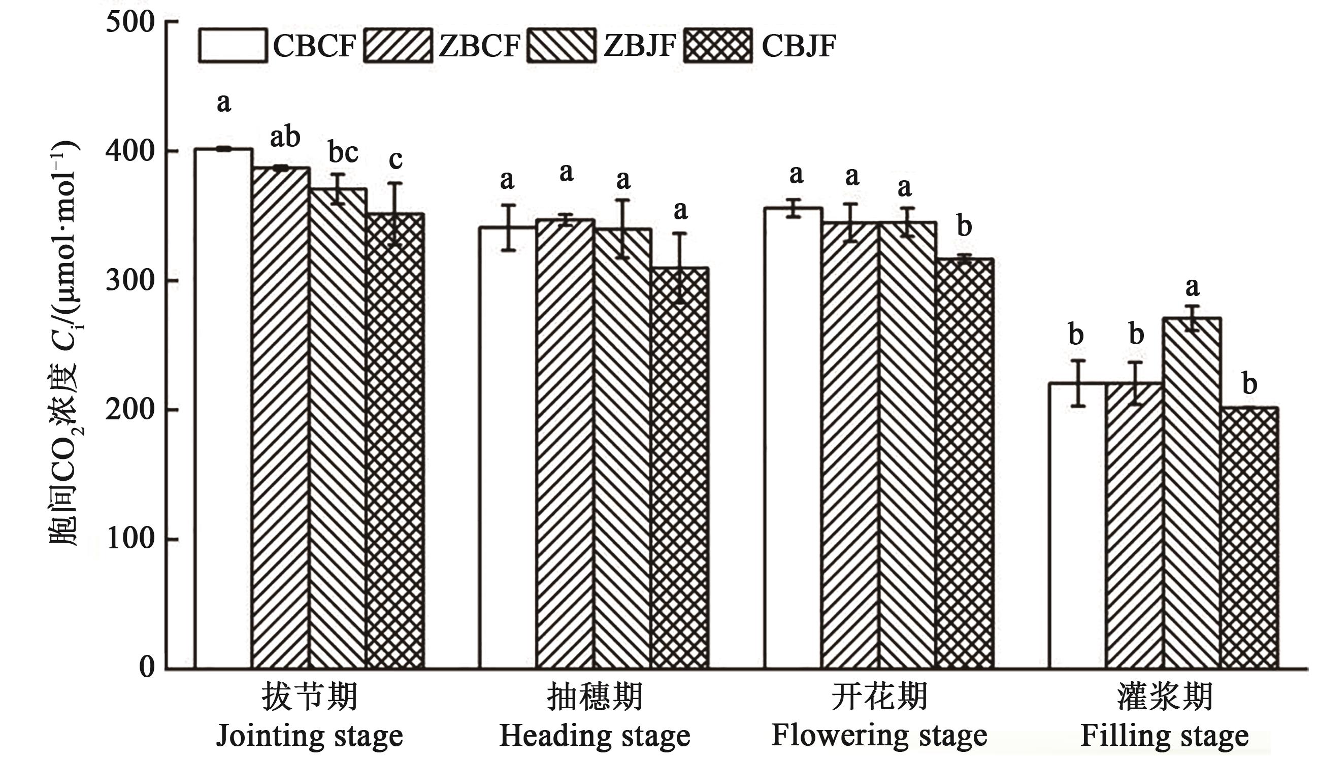 Fig. 2 Intercellular CO2 concentrations at different growth stages under different treatmentsNote: Different lowercase letters in same stage indicate significant differences between different treatments at P<0.05 level.