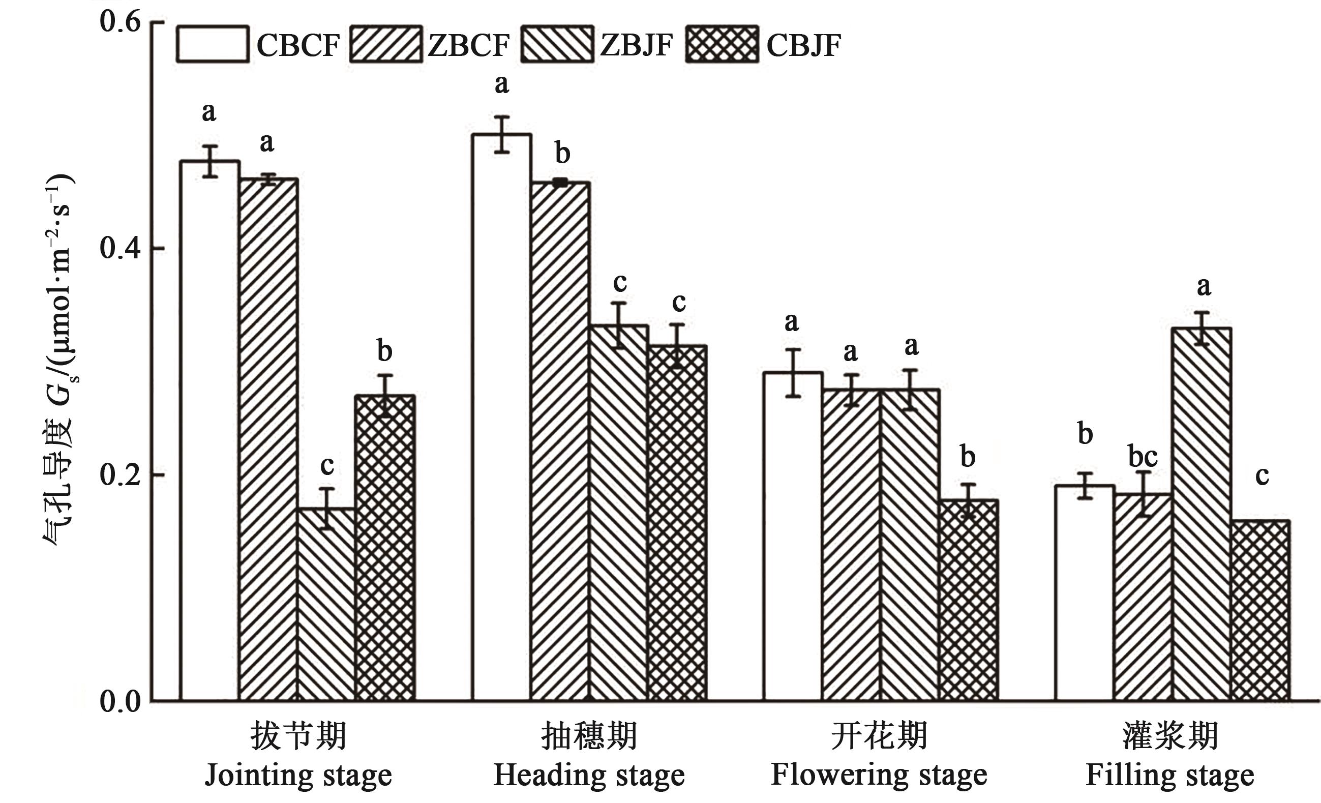 Fig. 3 Stomatal conductance at different growth stages under different treatmentsNote: Different lowercase letters in same stage indicate significant differences between different treatments at P<0.05 level.
