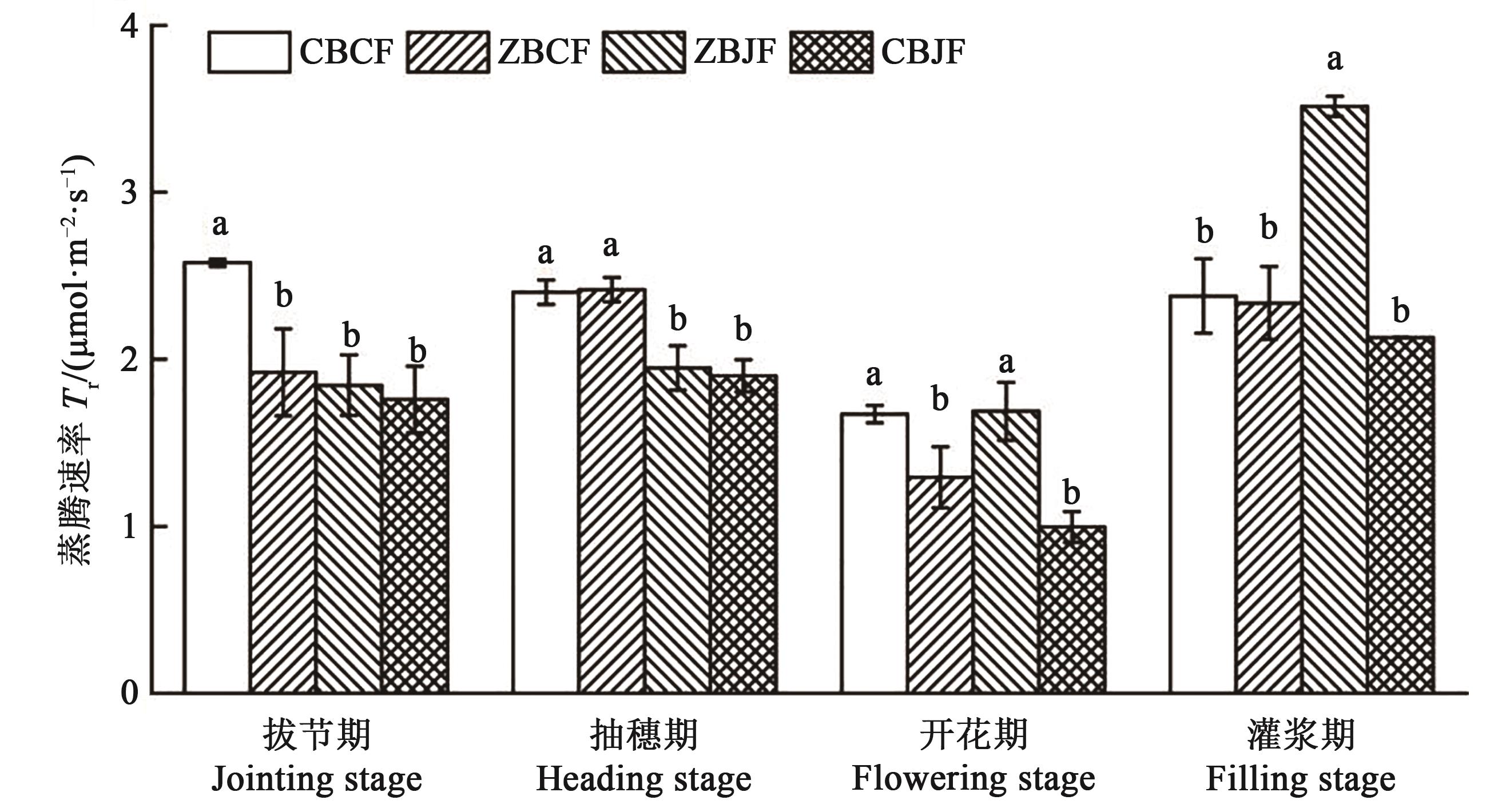 Fig. 4 Transpiration rates at different growth stages under different treatmentsNote: Different lowercase letters in same stage indicate significant differences between different treatments at P<0.05 level.
