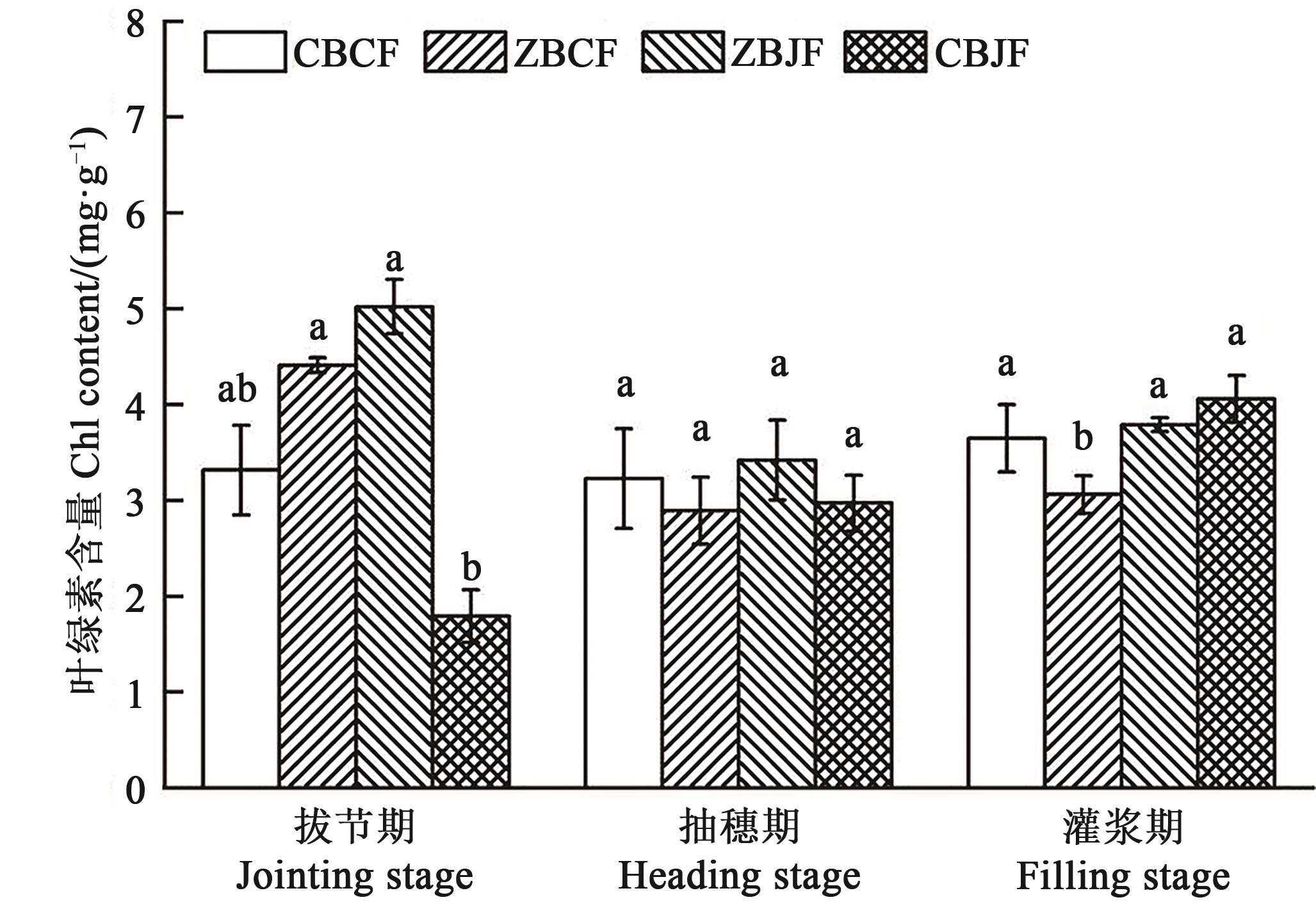 Fig. 5 Chlorophyll content at different growth stages under different treatmentsNote: Different lowercase letters in same stage indicate significant differences between different treatments at P<0.05 level.