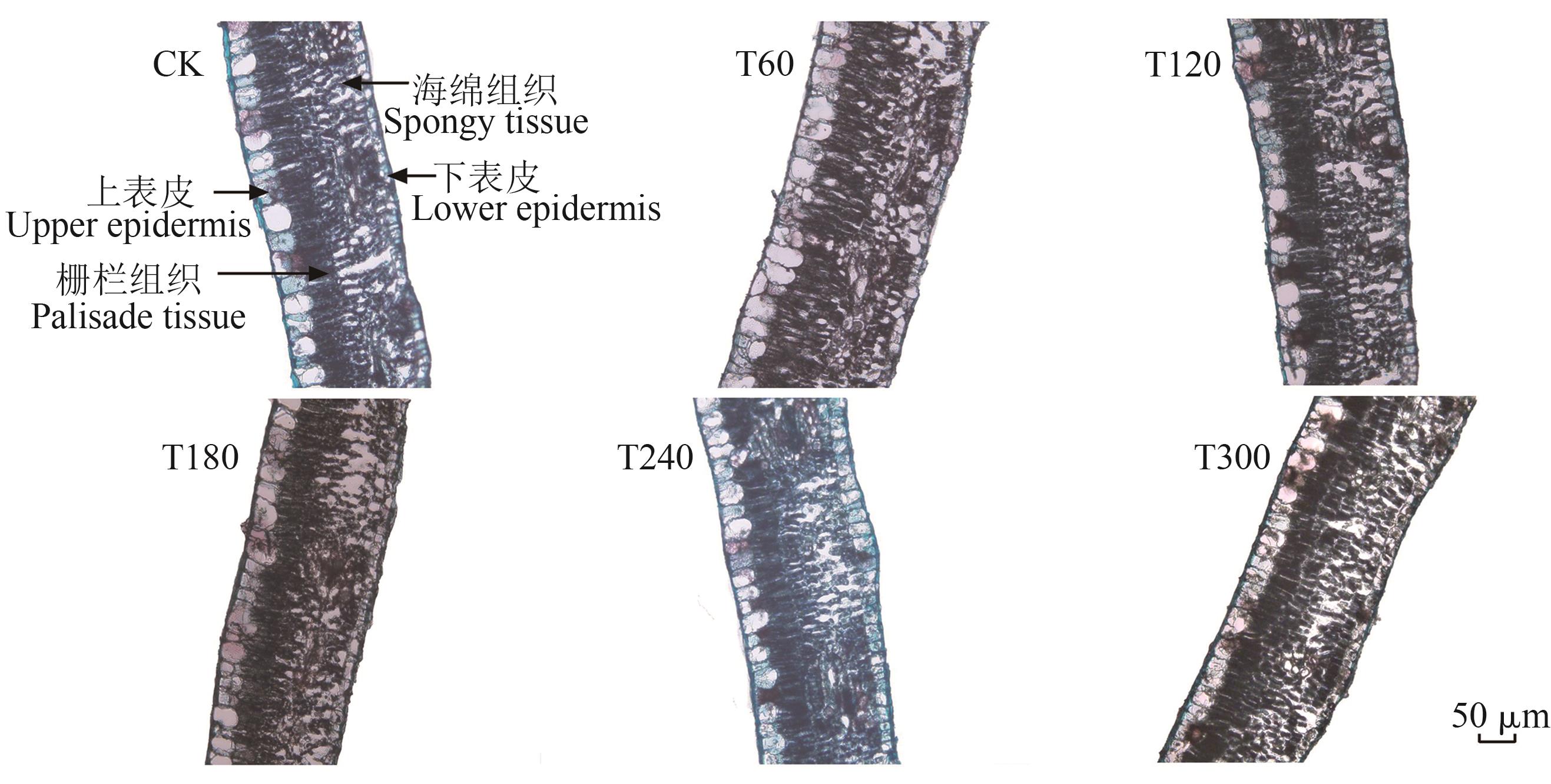 栅栏组织厚度 Palisade tissue thickness/μm | 76.69±11.77 b | 84.25±8.13 a | 82.68±11.94 a | 80.76±5.49 ab | 79.21±8.11 ab | 79.57±11.01 ab |