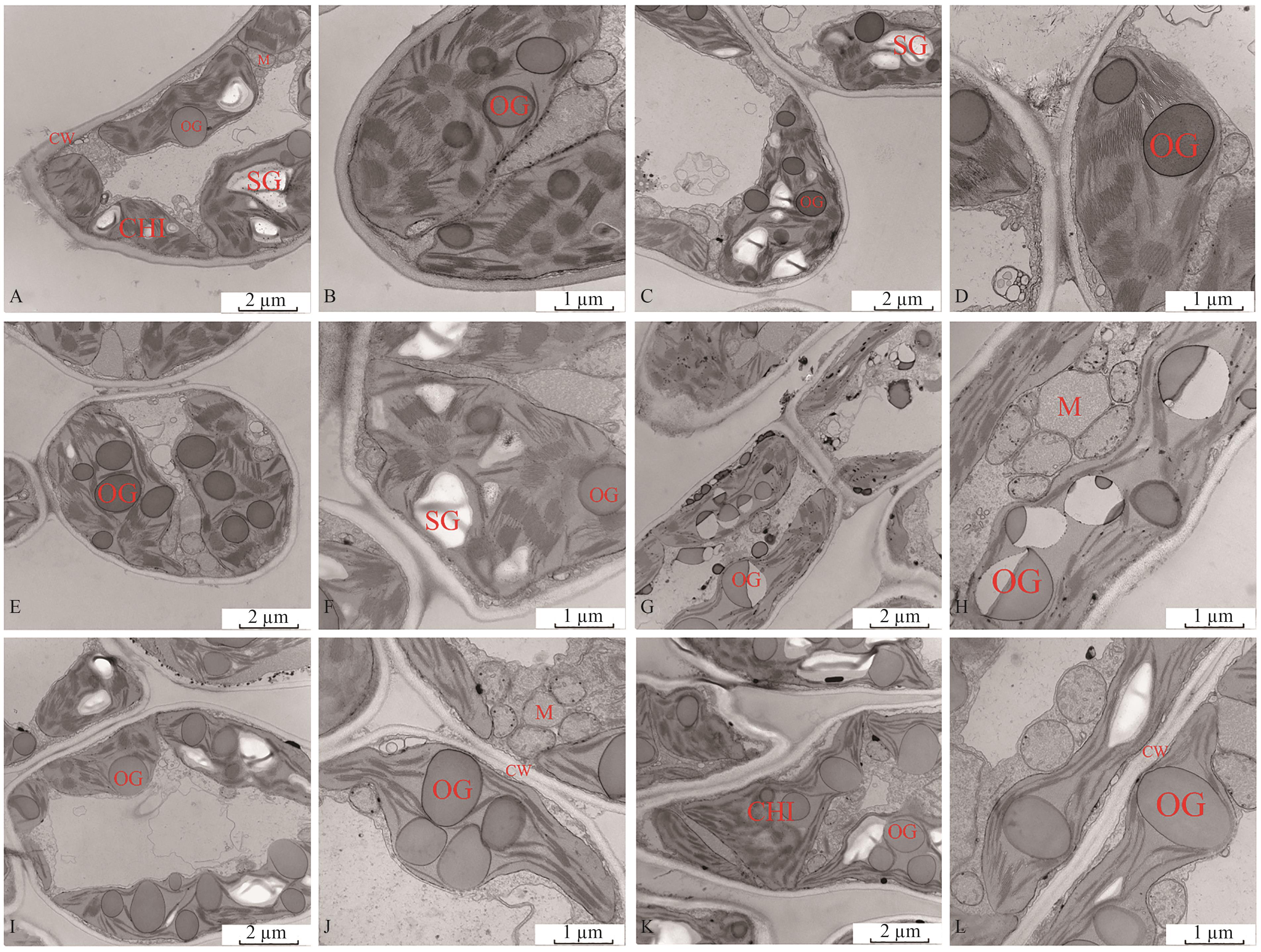 Fig. 2 Ultrastructure of Junzao leaves under different treatmentsA~B: CK; C~D: T60; E~F: T120; G~H: T180; I~J: T240; K~L: T300. CW—Cell wall; CHI—Chloroplast; M—Mitochondrion; OG—Osmiophilic granule; SG—Starch grain