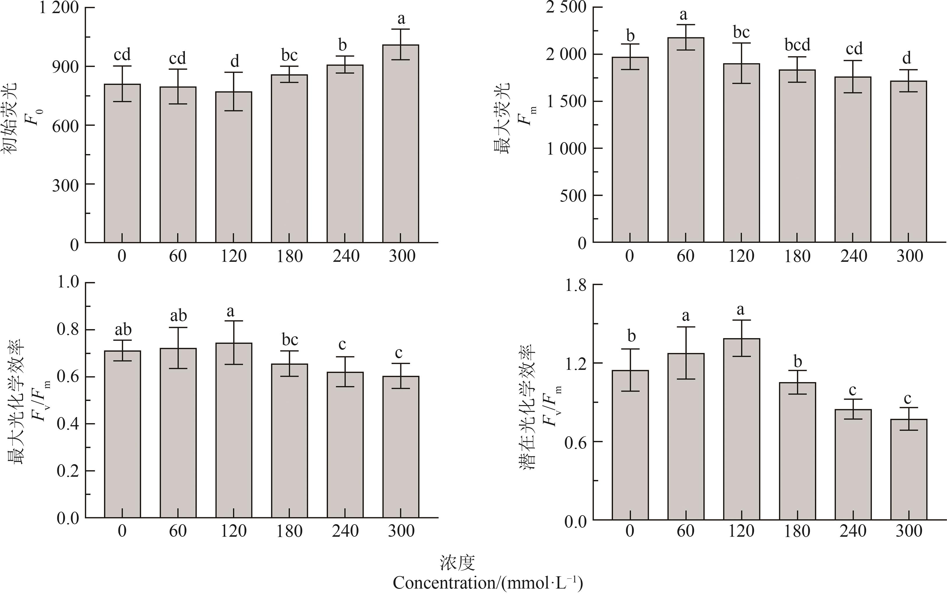 Fig. 4 Chlorophyll fluorescence parameters of Junzao leaves under differenttreatmentsNote: Different lowercase letters indicate significant differences between different treatments at P<0.05 level.