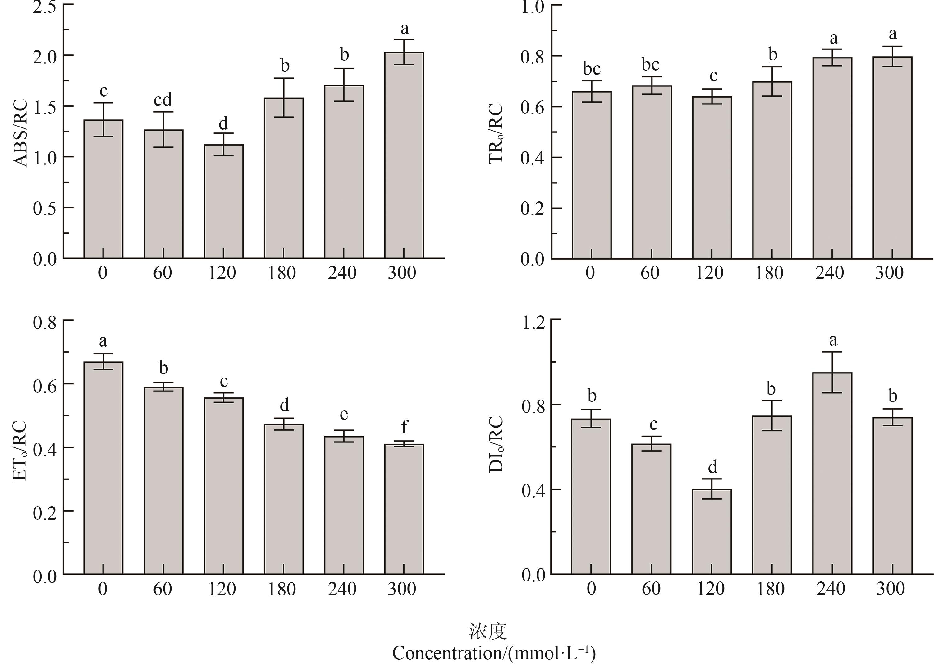 图5 不同处理下骏枣叶片的PSⅡ反应中心活性注:不同小写字母表示不同处理间在P<0.05水平差异显著。