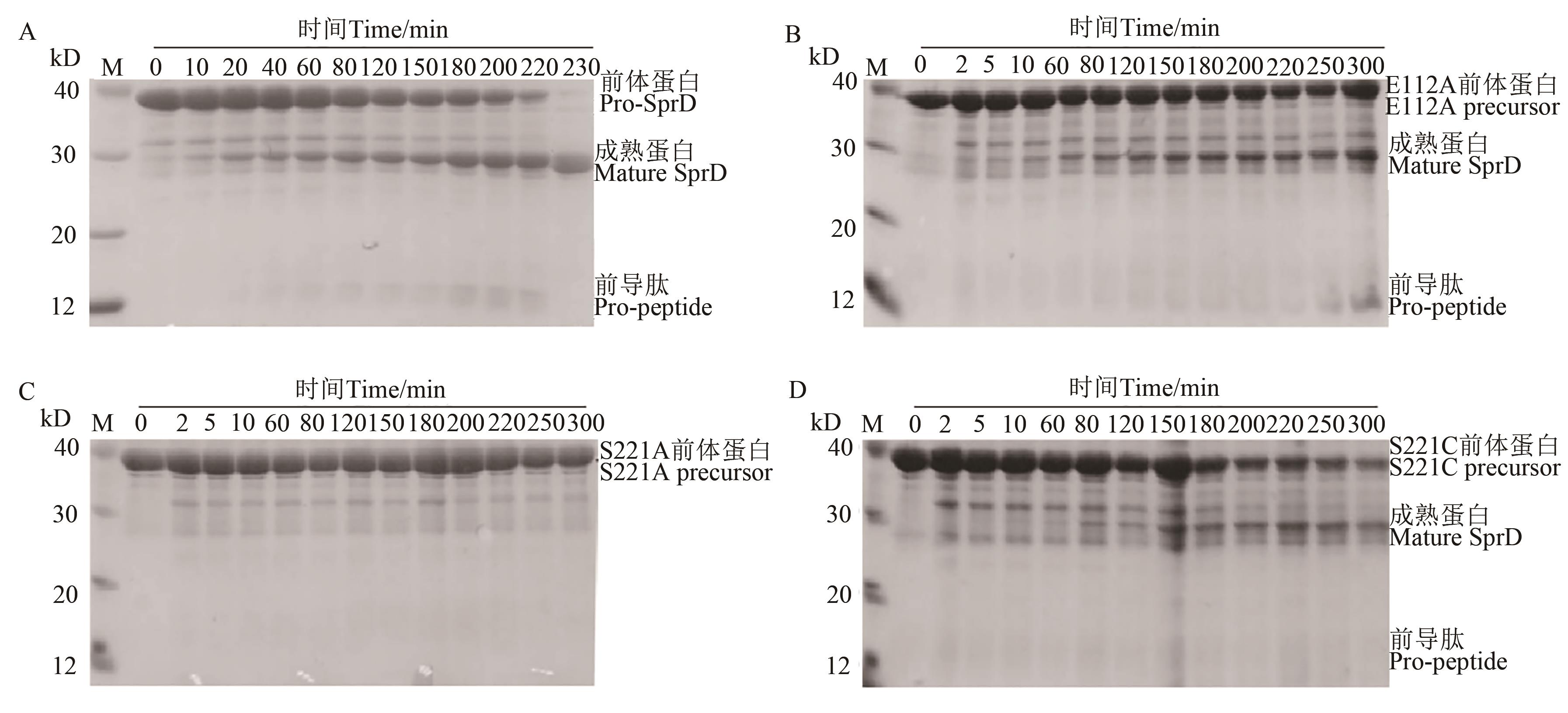 图2 野生型前体蛋白体外加工为成熟酶A: 野生型前体蛋白的折叠与成熟;B~D: E112A、S221A和S221C前体蛋白的折叠与成熟