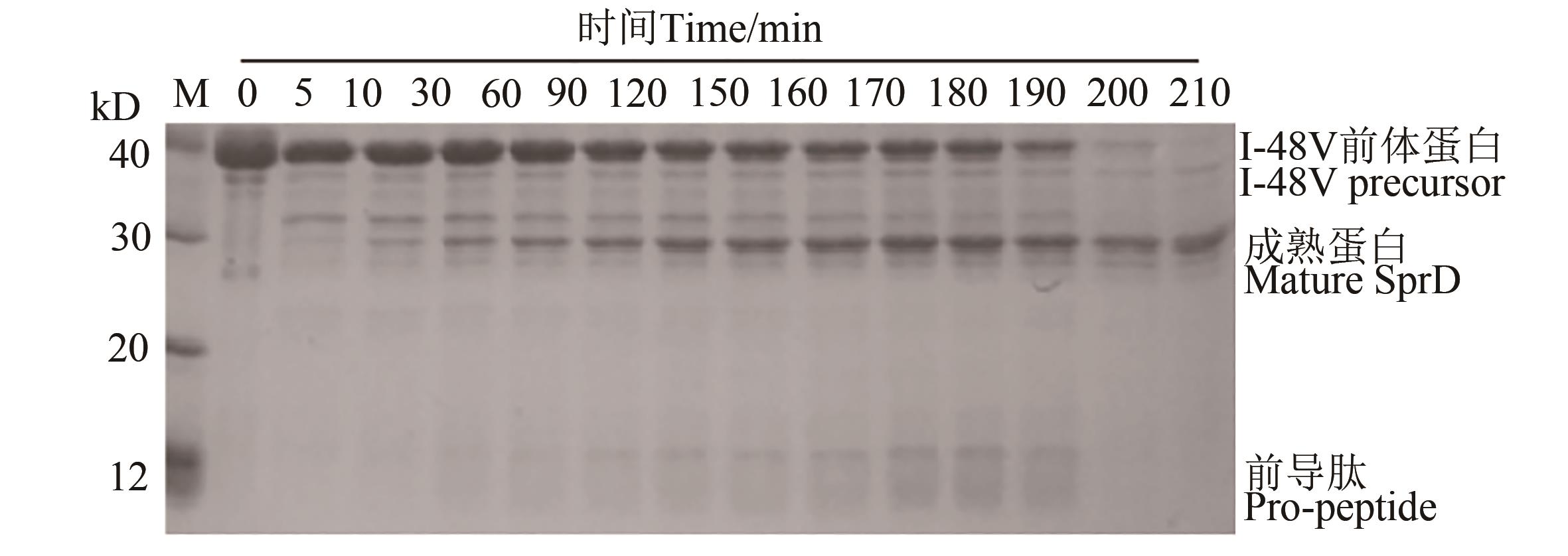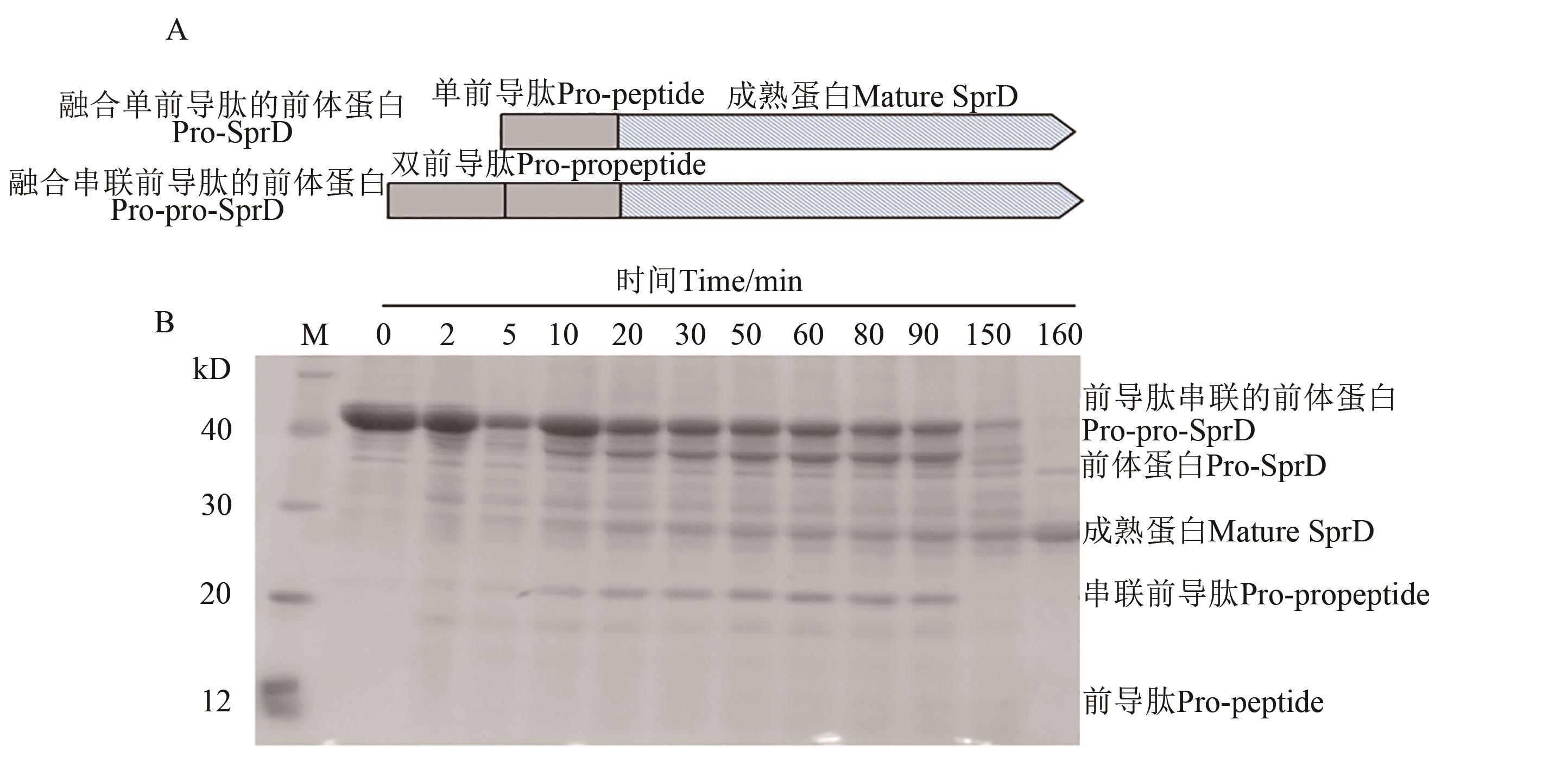 图3 Pro-pro-SprD前体蛋白的成熟过程A:前导肽串联表达示意图;B: Pro-pro-SprD前体蛋白的加工与成熟