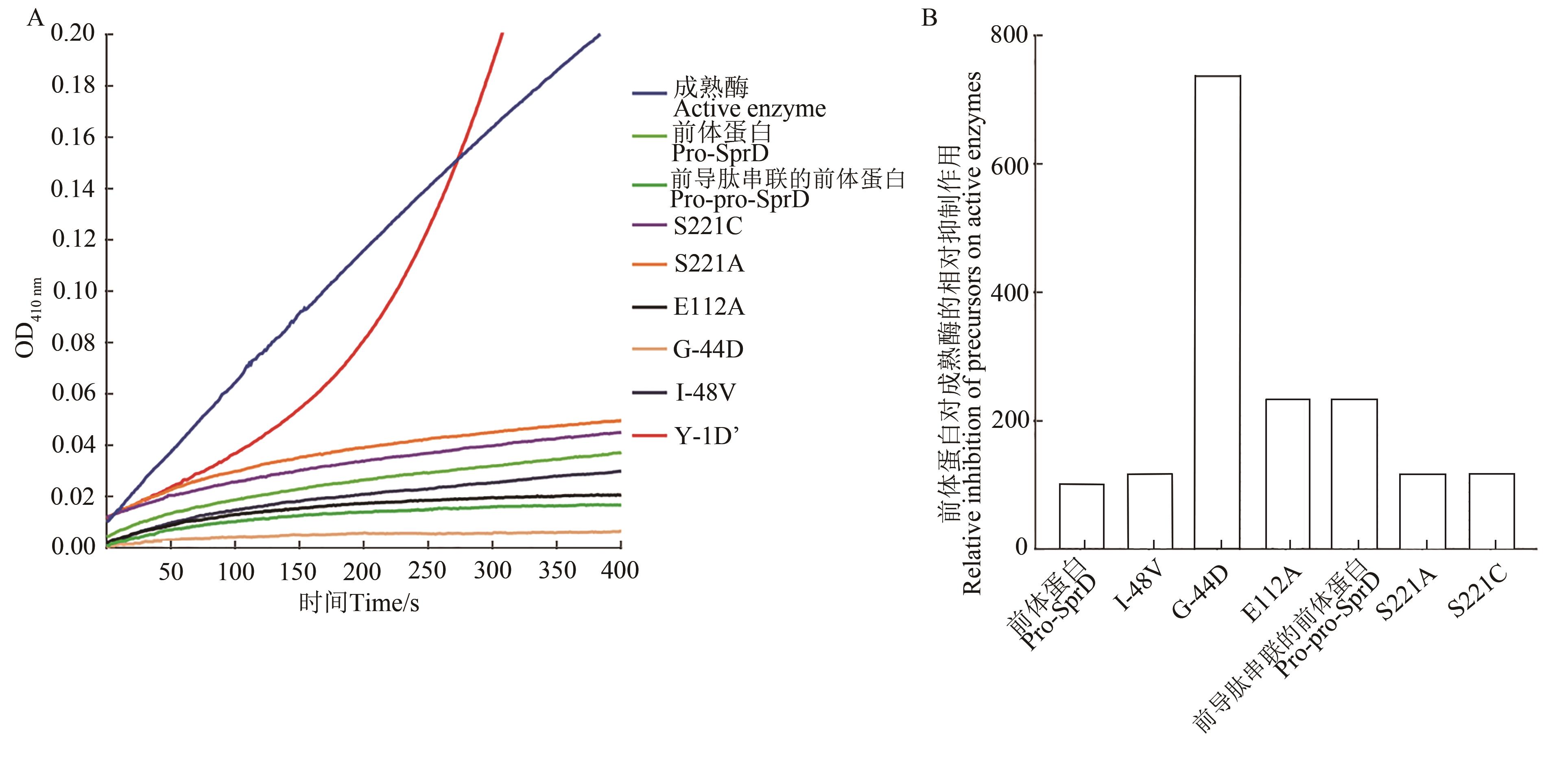 Fig. 6 Precursor proteins affect the activity of mature enzymesA: Precursors inhibited the action of active enzymes; B: Relative inhibition of precursors on enzymes